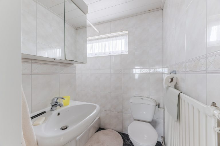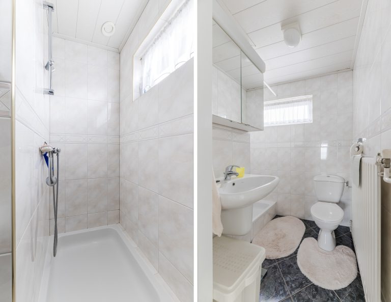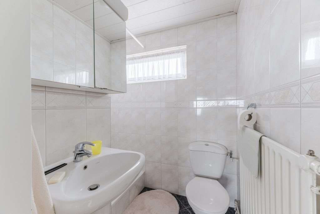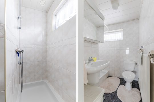 De badkamer is volledig betegeld in een neutrale kleurstelling en heeft een verzorgde, tijdloze uitstraling. Hier beschik je over een douche, toilet, wastafel en een handige spiegelkast waarin je al je toiletspullen netjes kunt opbergen.