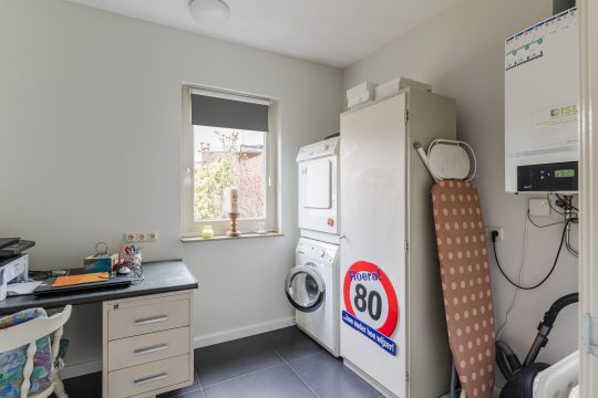 Aansluitend vind je de praktische bijkeuken met tegelvloer, wasmachine-aansluiting en de opstelling van de cv-installatie, ideaal voor extra opslag en het uit het zicht plaatsen van apparatuur.