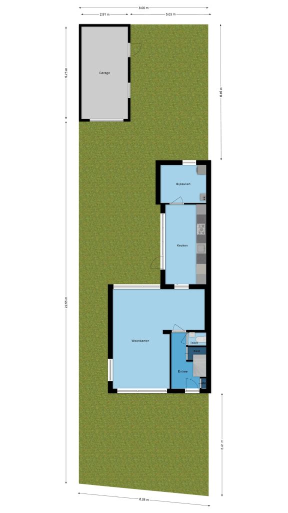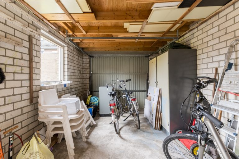 Achter in de tuin staat de in spouwmuren gemetselde garage met elektra en een stalen kanteldeur. Ideaal voor het stallen van je auto, fietsen en gereedschap of als extra hobbyruimte.