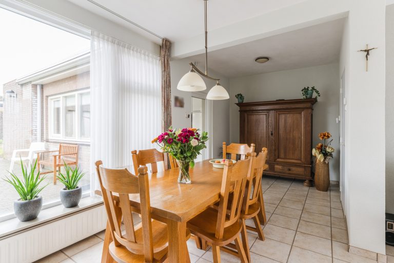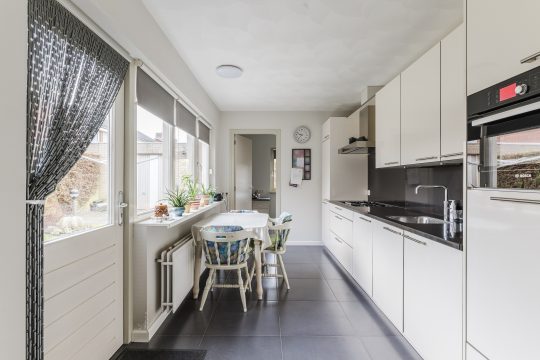 De leefkeuken vormt echt het hart van het huis en is in 2011 aan de achterzijde uitgebouwd, wat zorgt voor extra leefruimte en comfort. Ook hier ligt een tegelvloer en via de deur loop je zo de achtertuin in. De moderne keukeninrichting in wandopstelling is van alle gemakken voorzien. Je kookt hier met plezier op de 5-pits gaskookplaat en hebt de beschikking over een afzuigkap, koel-vriescombinatie, vaatwasser op hoogte, combi-oven, Quooker en een stijlvol composiet aanrechtblad.
