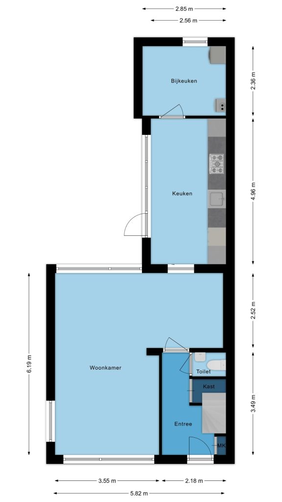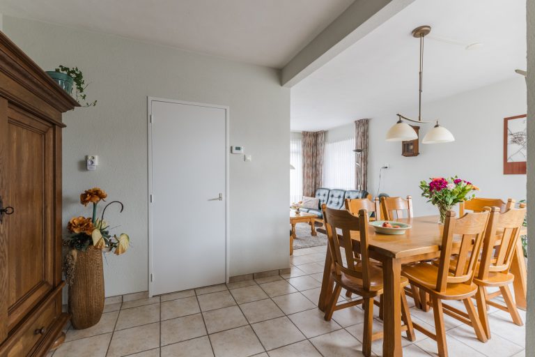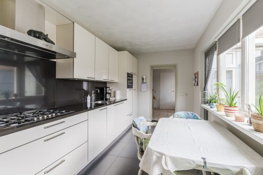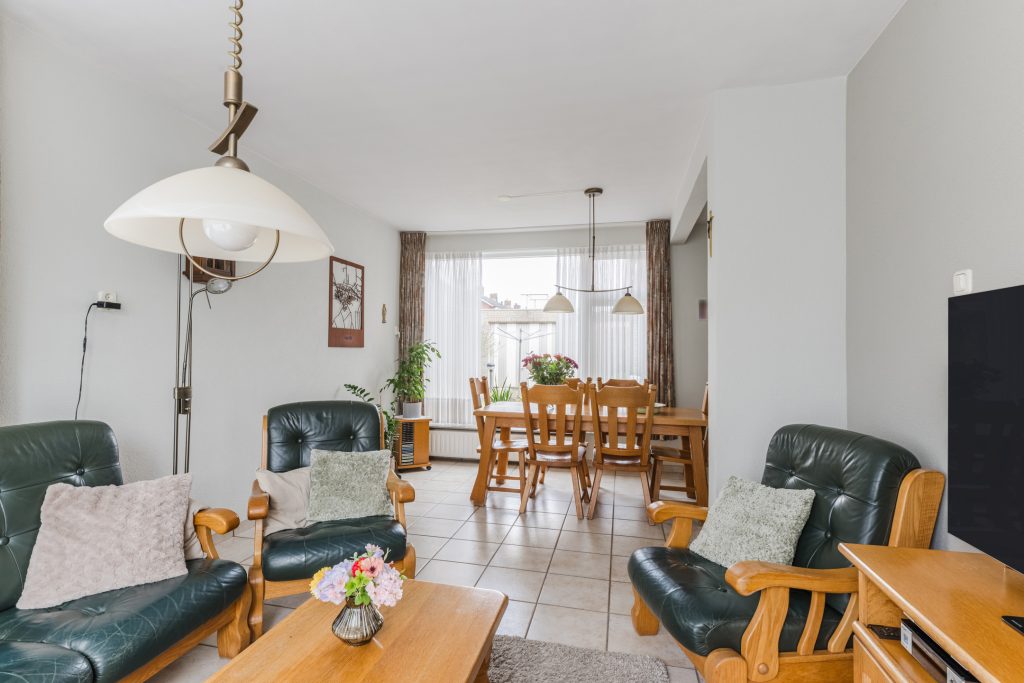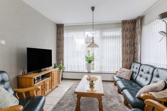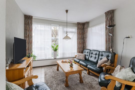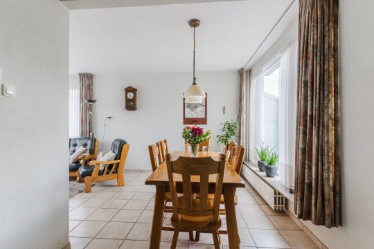 De ruime L-vormige woonkamer voelt heerlijk licht en open aan dankzij de grote raampartijen. De tegelvloer, spachtelputzwanden en het spuitwerkplafond zorgen voor een frisse en verzorgde uitstraling. Dit is een fijne plek waar je moeiteloos een comfortabele zithoek én een gezellige eethoek creëert. Via een schuifdeur sta je in de aangebouwde leefkeuken.