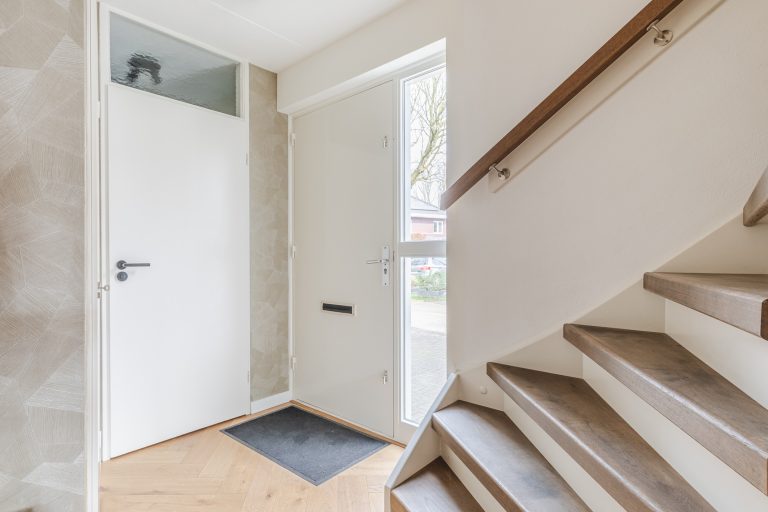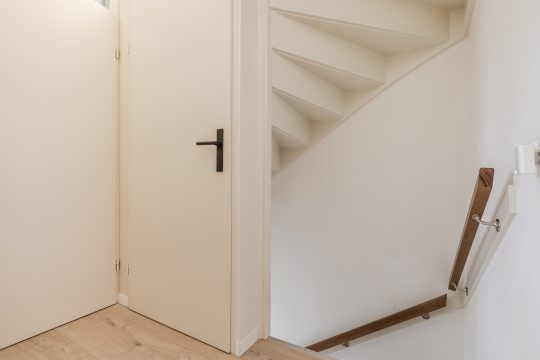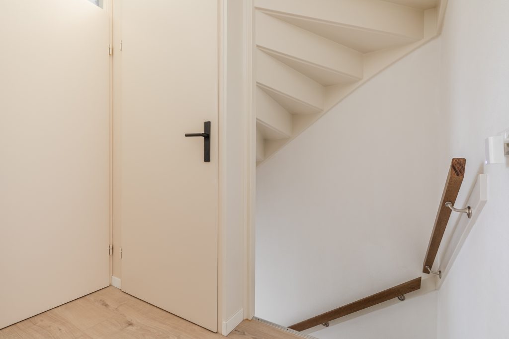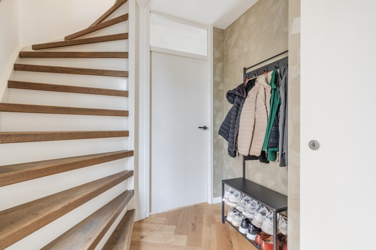 Via de eigen oprit bereik je de entree. De hal is verzorgd ingericht met garderobe, een vernieuwde meterkast met zes groepen, krachtgroep en glasvezel en een luxe toiletruimte uit 2023 met hangcloset, fonteintje en een chique beige visgraat achterwand. De trap is bekleed met eiken en vormt een stijlvol detail.