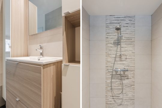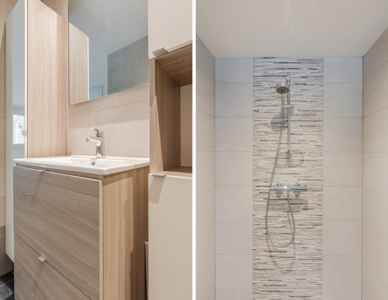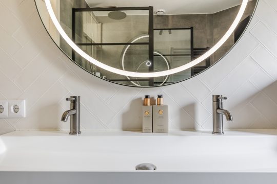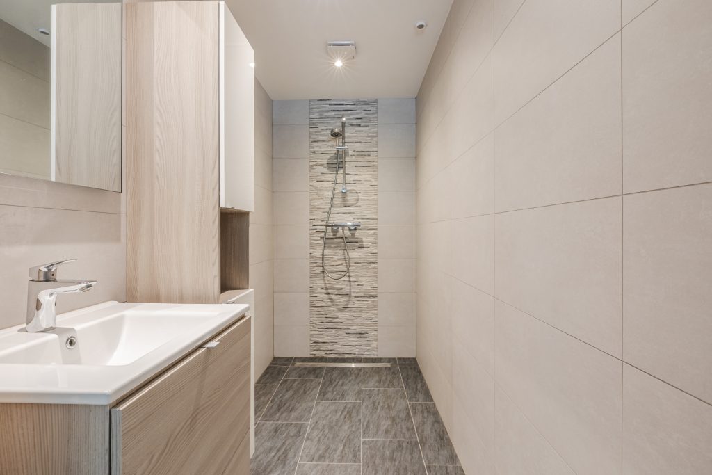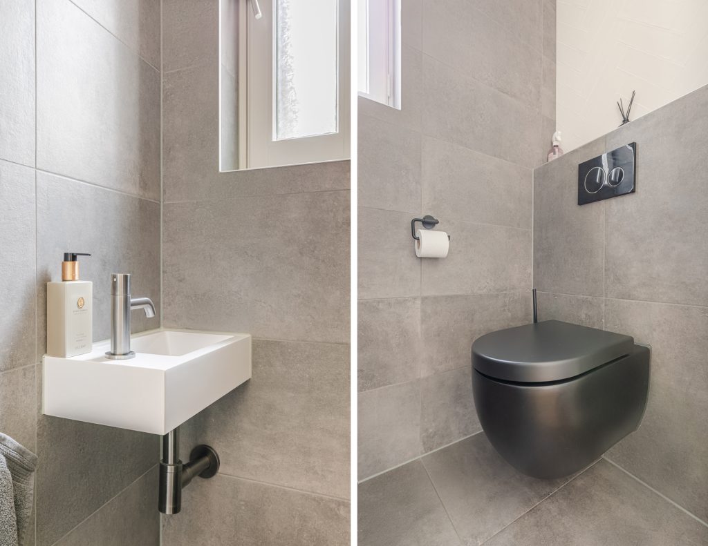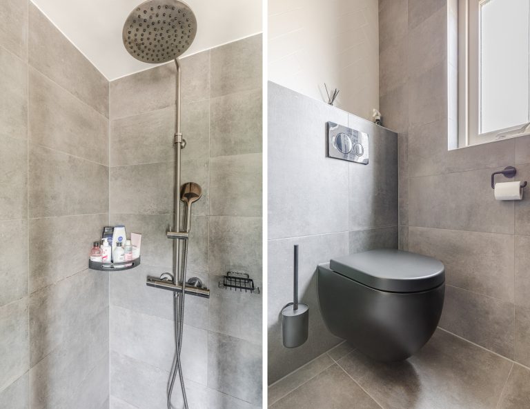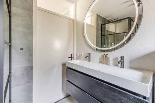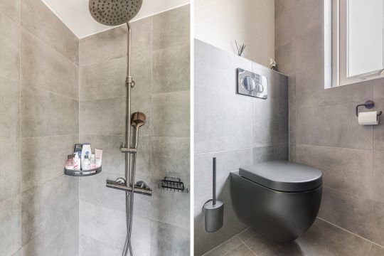 De badkamer is stijlvol uitgevoerd met betonlook tegels in combinatie met beige visgraat wandtegels en gun metal kranen. Hier vind je een ruime inloopdouche met hand en regendouche, een dubbel wastafelmeubel met verlichte spiegel, een hangcloset, designradiator en mechanische ventilatie.