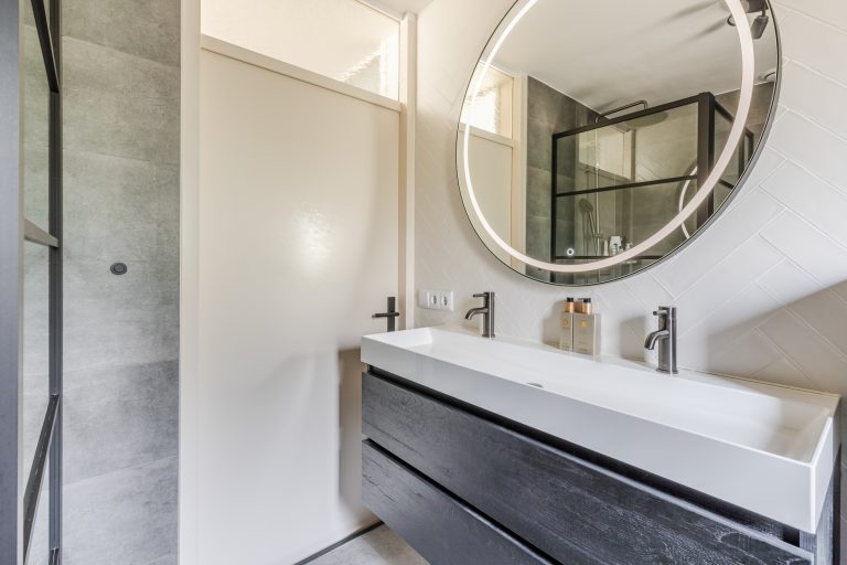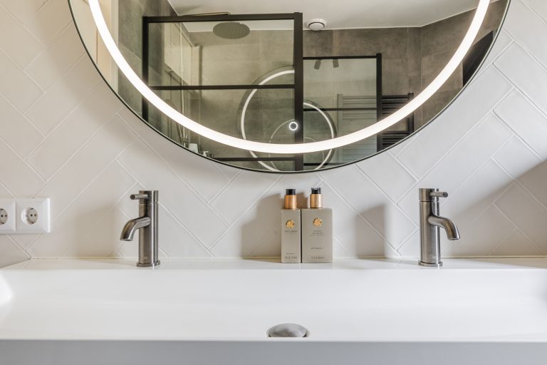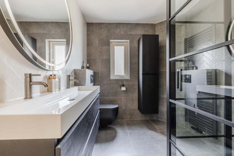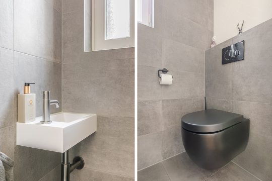 • Stijlvolle badkamer met gun metal kranen en dubbel wastafelmeubel