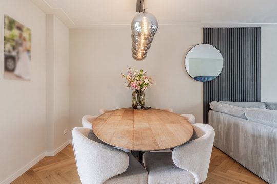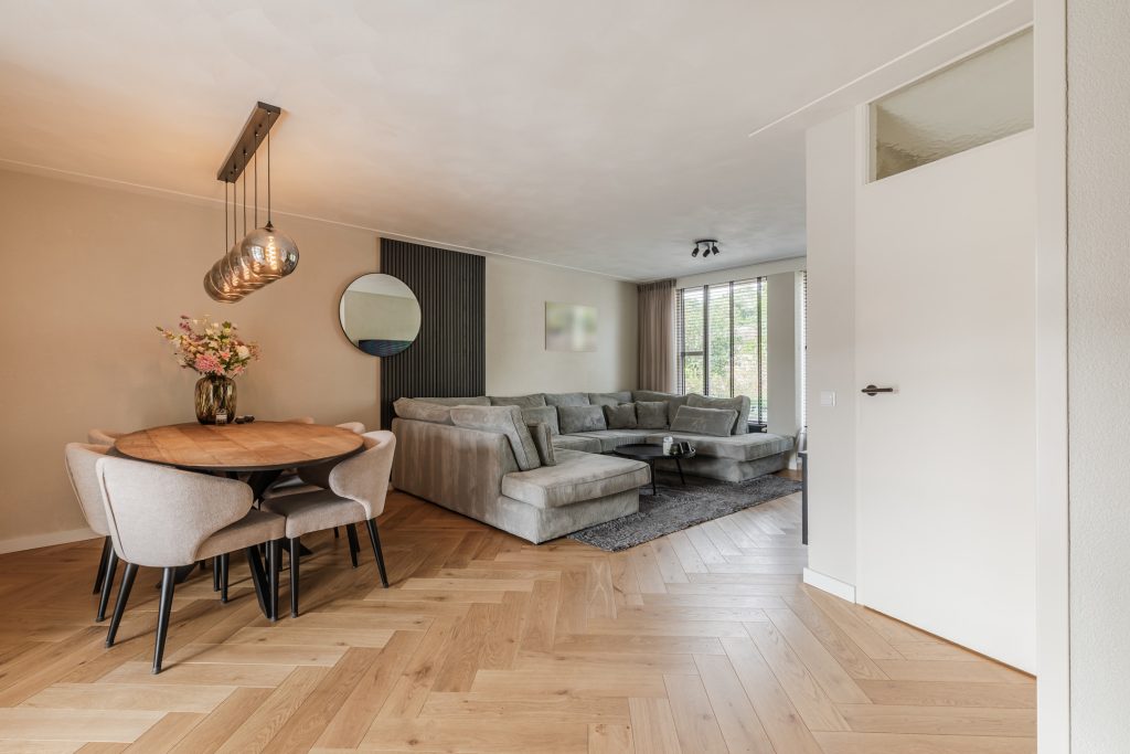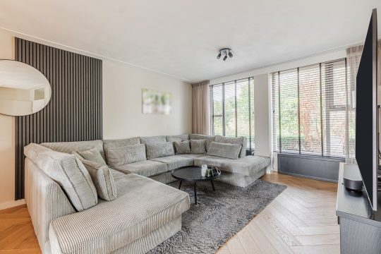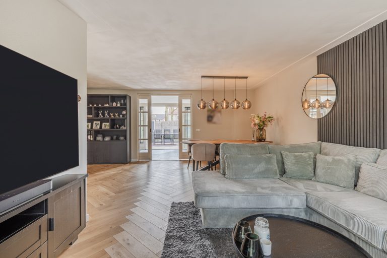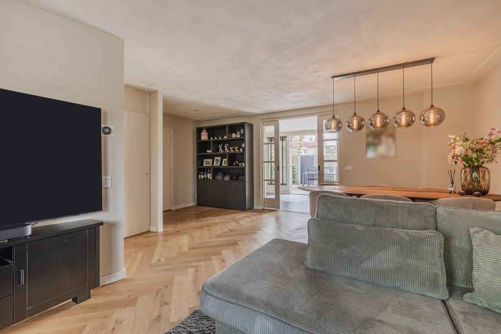 De woonkamer is royaal en licht dankzij de vele raampartijen. De visgraat gelegde multiplank vloer met eiken toplaag en vloerverwarming geeft direct warmte en comfort. Aan de voorzijde ligt het ruime zitgedeelte. Hier is meer dan voldoende plek voor een grote zithoek. De maatwerk tv wand en de praktische trapkast zorgen voor extra functionaliteit.