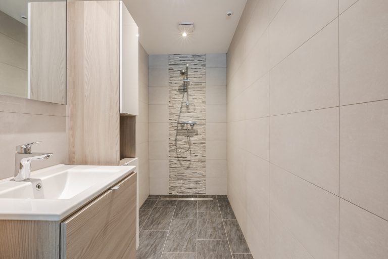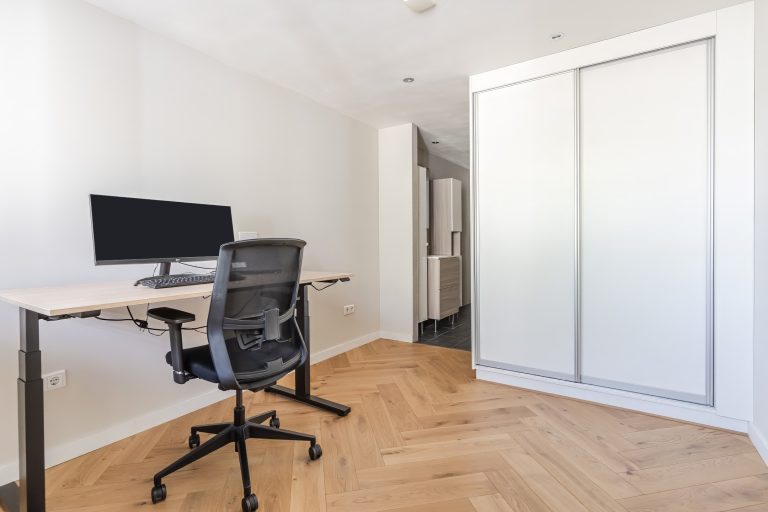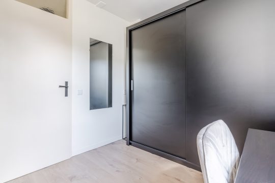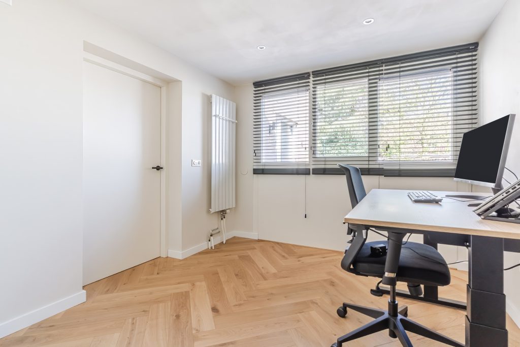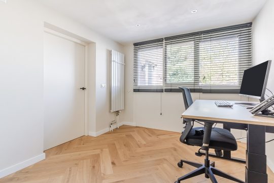 Op de begane grond bevindt zich bovendien een extra slaapkamer met inbouwkast en dezelfde visgraat vloer. Deze kamer is ideaal als slaapkamer, kantoor of speelruimte. De aangrenzende badkamer is volledig betegeld en voorzien van een inloopdouche en een badmeubel met infrarood spiegelverwarming. Hiermee is de woning volledig levensloopbestendig.