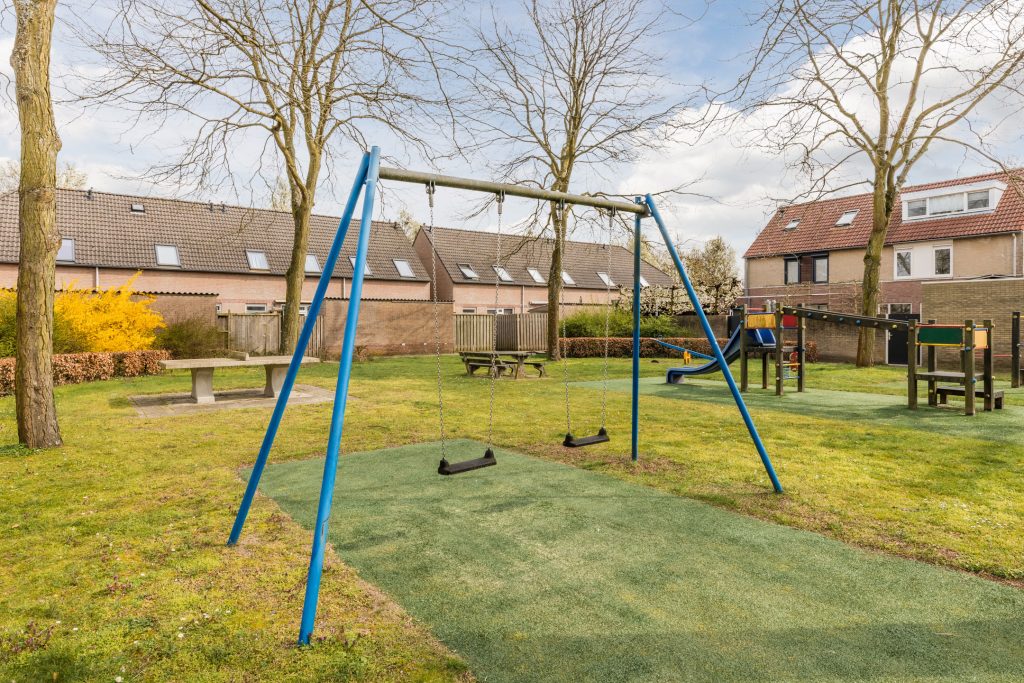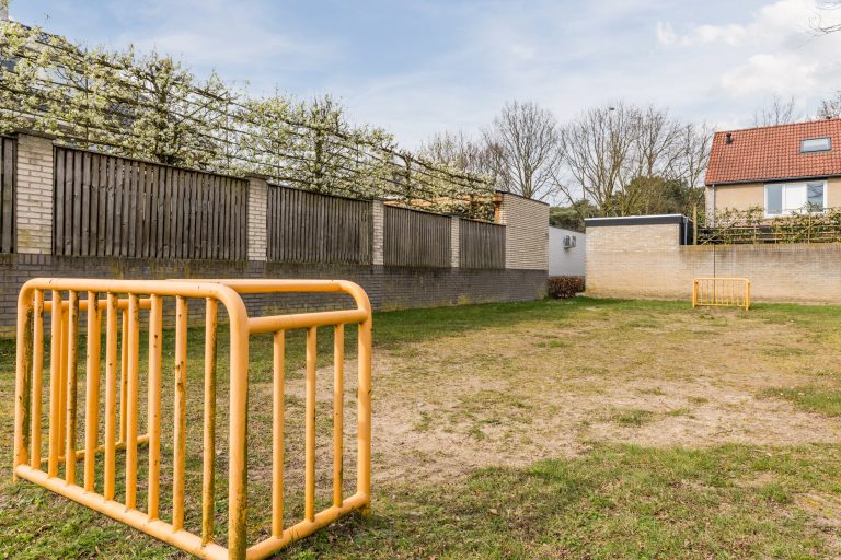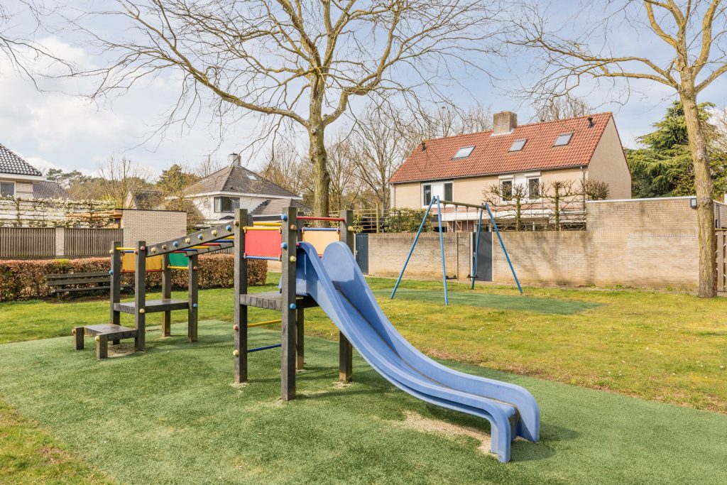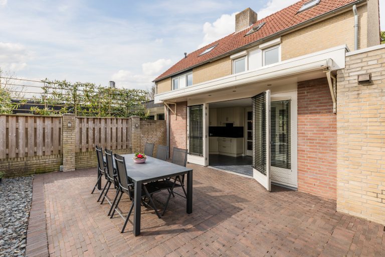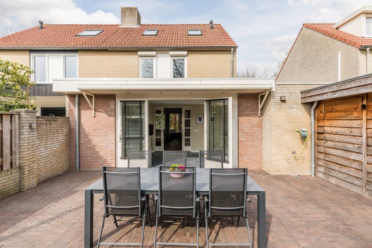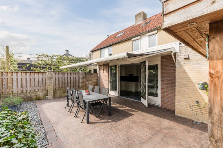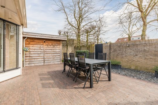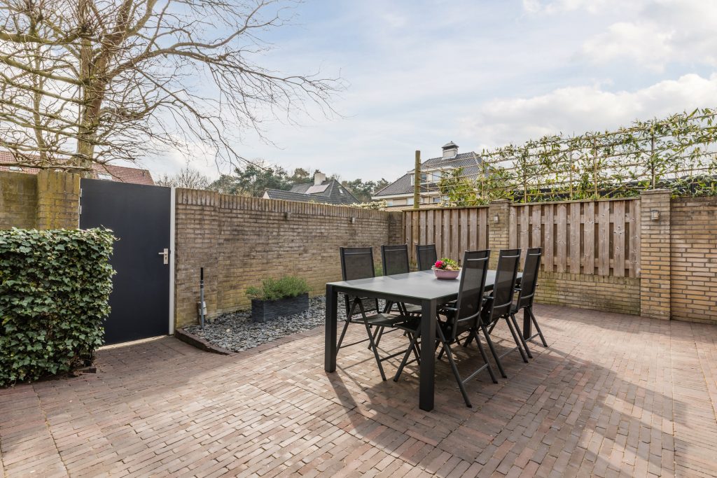 De achtertuin ligt op het zonnige zuiden en biedt veel privacy. Het terras is strak betegeld met antracietkleurige tegels en voorzien van een diepe, elektrische zonneluifel met chique inbouwspots in de overstek. Er zijn meerdere elektrapunten, een buitenkraan, een praktische plek voor afvalcontainers en een Douglas berging met elektra aanwezig. Via de eigen achterom lopen kinderen direct de aangrenzende speeltuin in. Dit maakt de ligging ideaal voor gezinnen.