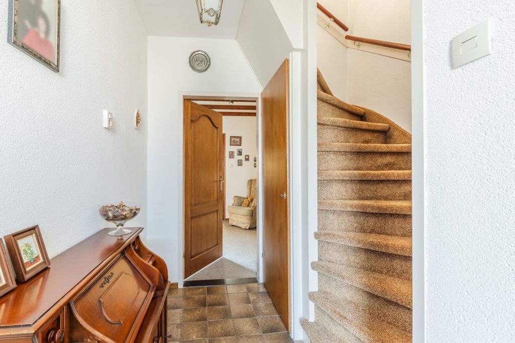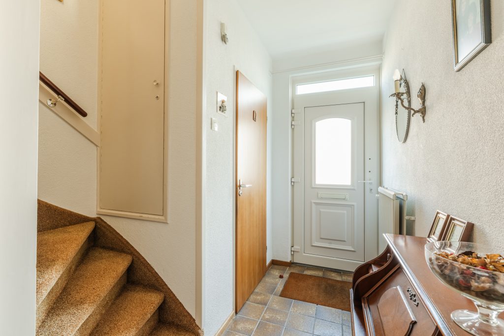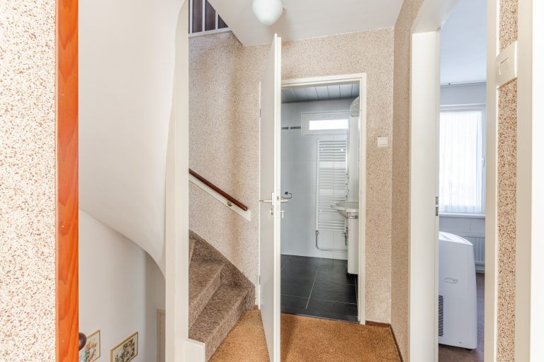 Via de hal met tegelvloer betreed je de woning. Hier vind je de volledig betegelde, gemoderniseerde toiletruimte met wandcloset en fonteintje, de meterkast, een praktische trapkast en de trapopgang naar de eerste verdieping.