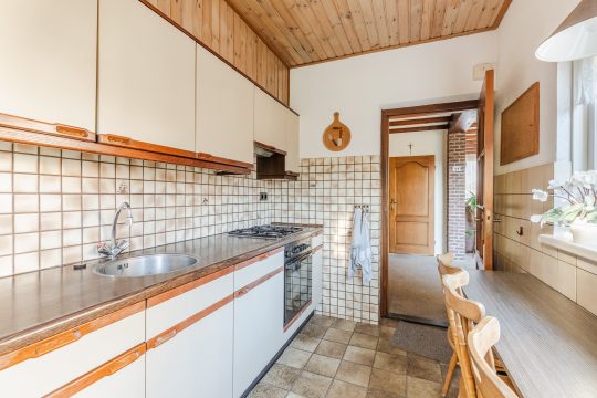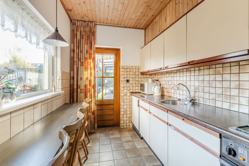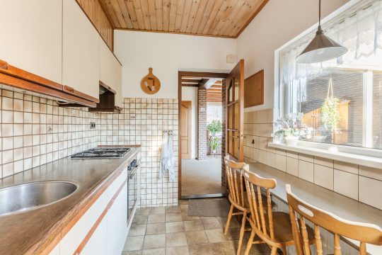 Aansluitend bevindt zich de dichte keuken, voorzien van een tegelvloer en een deur naar de achtertuin. De keukeninrichting in wandopstelling beschikt over een gaskookplaat, afzuigkap, oven en koelkast. Een functionele ruimte met potentie voor wie droomt van een moderne leefkeuken of eigentijdse upgrade.