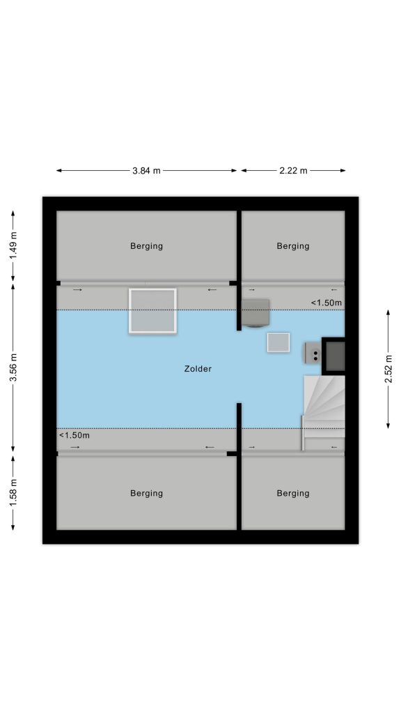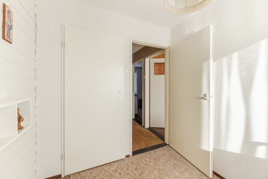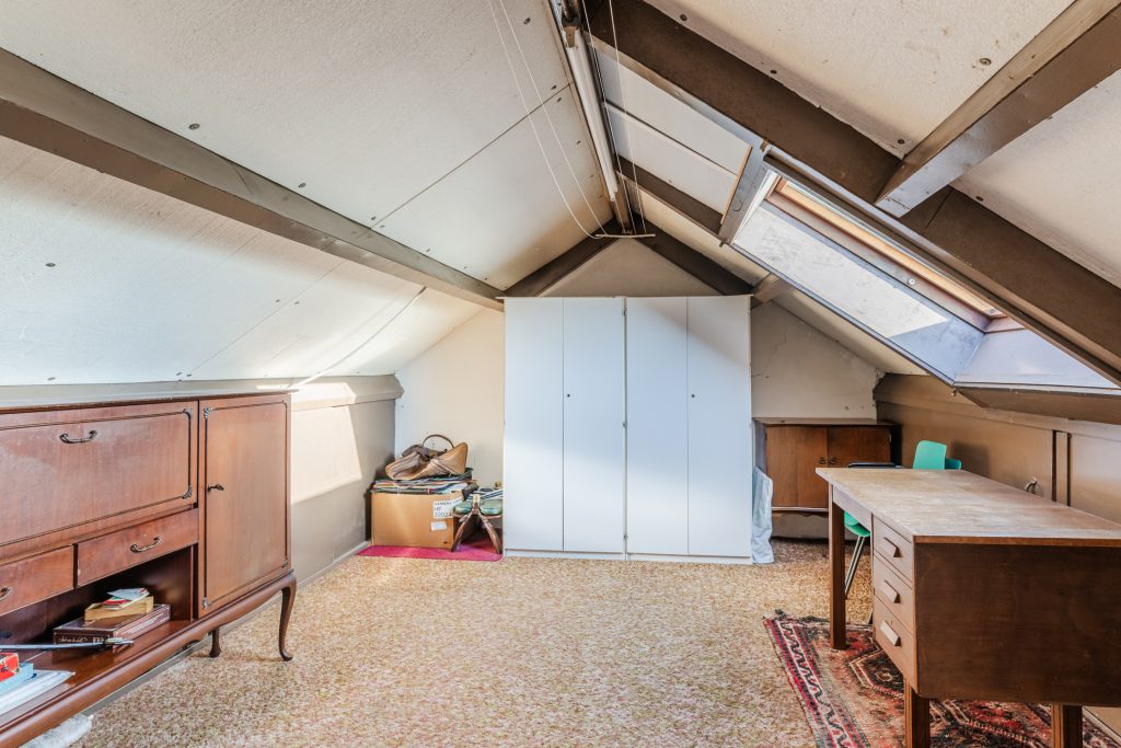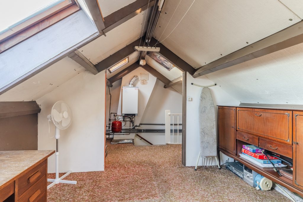 De zolderkamer biedt volop mogelijkheden voor het realiseren van een vierde slaapkamer, hobbyruimte of thuiswerkplek. Ook hier is vloerbedekking aanwezig en is er extra bergruimte onder de schuine kanten.