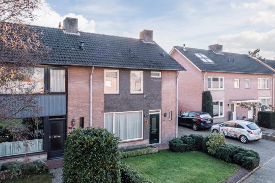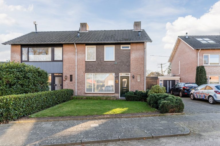 De woning beschikt over een nette voortuin met gazon en diverse beplanting. De oprit biedt parkeergelegenheid voor twee auto’s, ideaal voor gezinnen of gasten.
