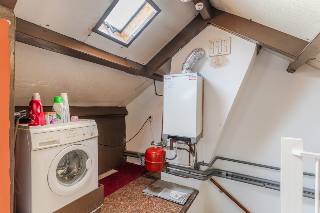 Via de vaste trap bereik je de tweede verdieping. Op de voorzolder zorgen een dakraam en de praktische indeling voor een prettige, lichte ruimte. Hier vind je de opstelling van de cv-installatie, de wasmachine-aansluiting en bergruimte aan beide zijden onder de dakschuinte.