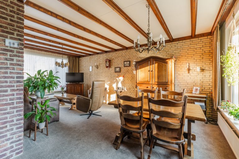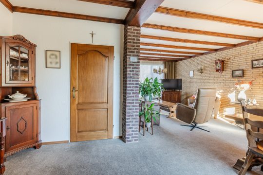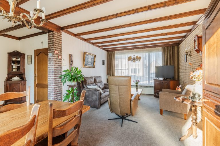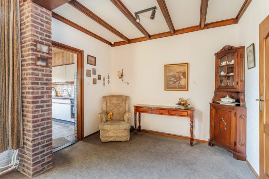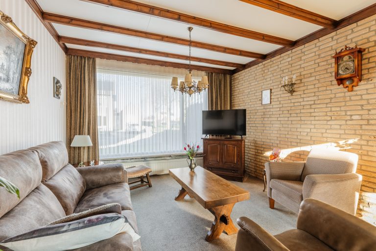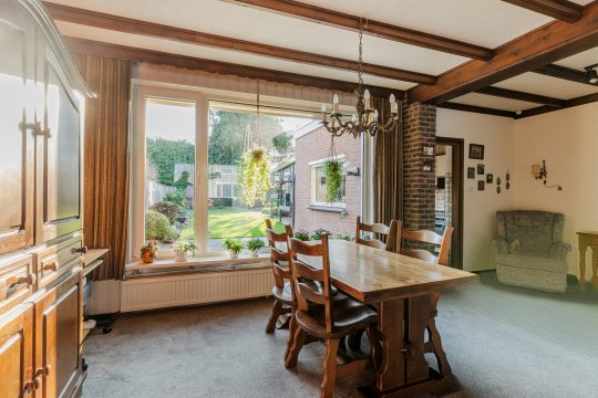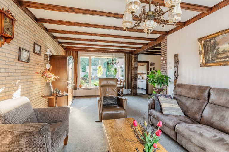 De hal biedt toegang tot de gezellige L-vormige woonkamer. Deze ruimte voelt direct prettig aan dankzij de grote raampartijen, de fijne lichtinval en het mooie uitzicht over de diepe achtertuin. De woonkamer is afgewerkt met vloerbedekking en biedt volop mogelijkheden om geheel naar eigen smaak te moderniseren en in te richten.