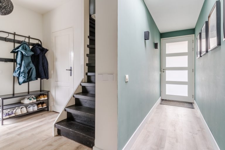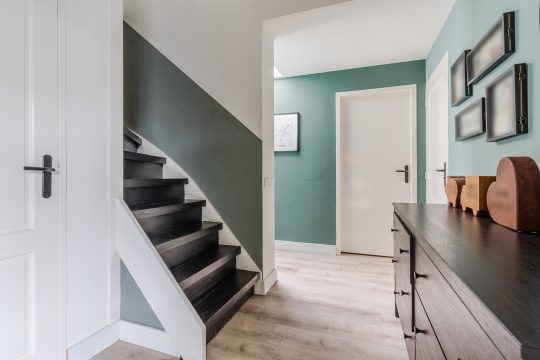 Via de eigen oprit en strak aangelegde voortuin bereik je de entree. Deze geeft een ruimtelijk en licht gevoel dankzij de lichtkoepel en is afgewerkt met een PVC vloer met vloerverwarming, strakke stucwerk wanden en strakke stucwerk plafonds. Vanuit de entree heb je toegang tot een moderne, volledig betegelde toiletruimte voorzien van een zwevend toilet met fonteintje en een diepe trapkast met de vernieuwde meterkast (9 groepen en fornuisgroep). Middels de matzwarte, stalen taatsdeur bereik je het woongedeelte.