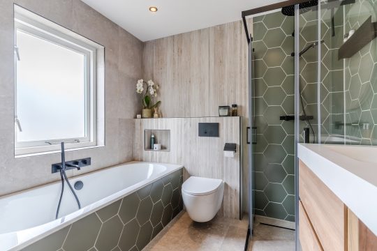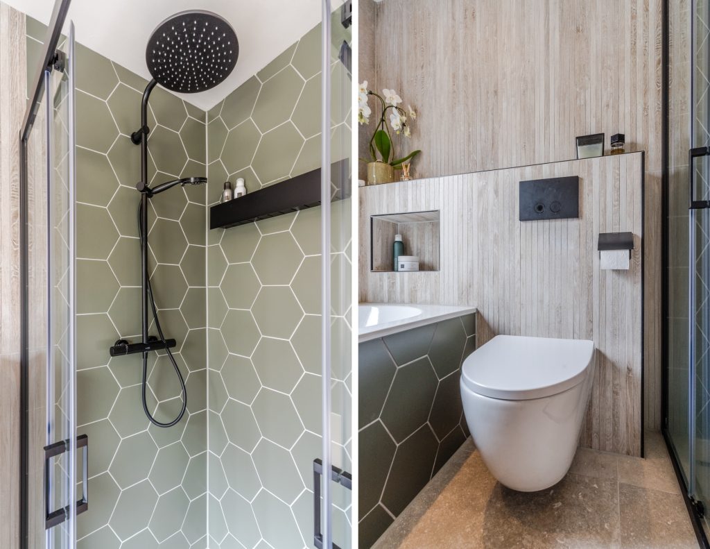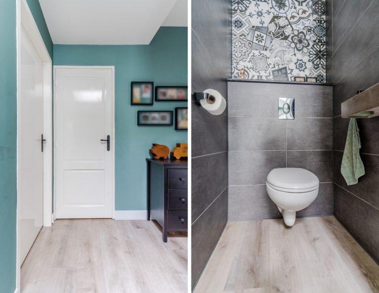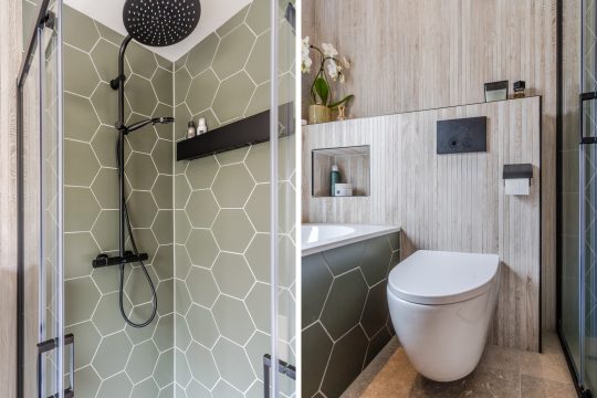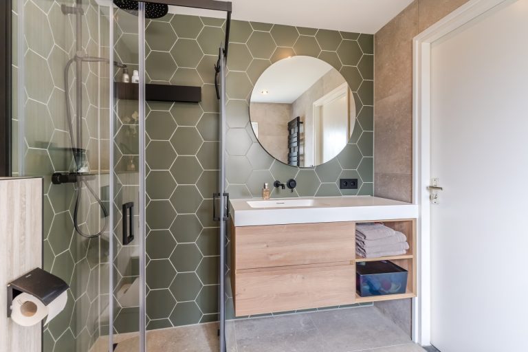 De volledig gerenoveerde badkamer (2023) is stijlvol afgewerkt met een betonlook tegel wat in combinatie met de mat groene hexagon tegels en houtlook achterwand voor een moderne uitstraling zorgt Tevens is de ruimte voorzien van alle luxe en comfort zoals een inloopdouche met regendouche en handdouche, ligbad met inbouwkranen, groot badmeubel met verlichte en verwarmde spiegel, hangcloset en designradiator.