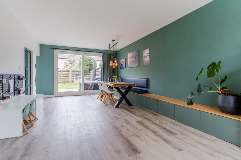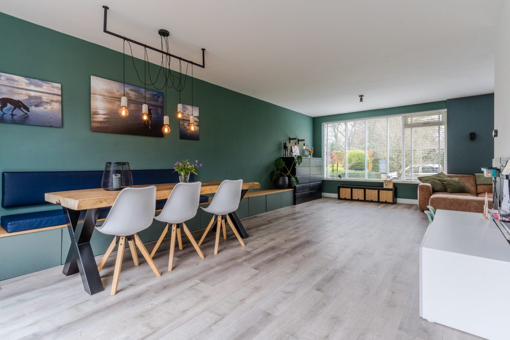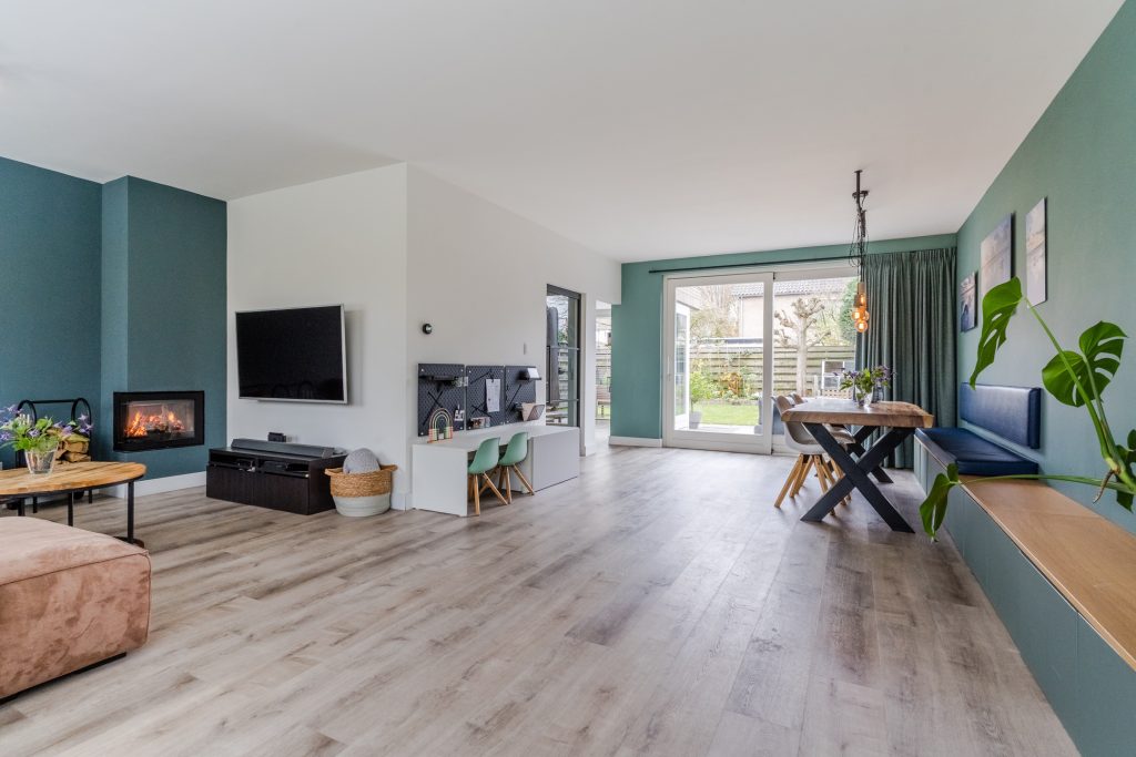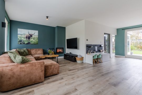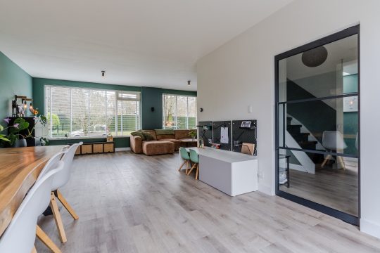 De woonkamer is heerlijk ruim en sfeervol ingericht. Dankzij de vele raampartijen is er volop daglicht en geniet je van een prettige leefomgeving. Een houtkachel zorgt voor extra sfeer en warmte. Via de schuifpui is de zonnige achtertuin toegankelijk. Het eetgedeelte, met ruimte voor een 8-persoons eettafel, staat in directe verbinding met de keuken. Tevens is er meer dan voldoende ruimte voor een speelhoek voor de kinderen. De aanwezige vloerverwarming maakt het geheel extra comfortabel.