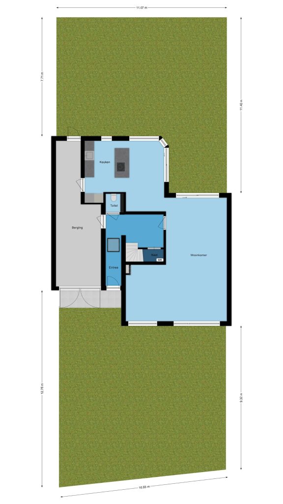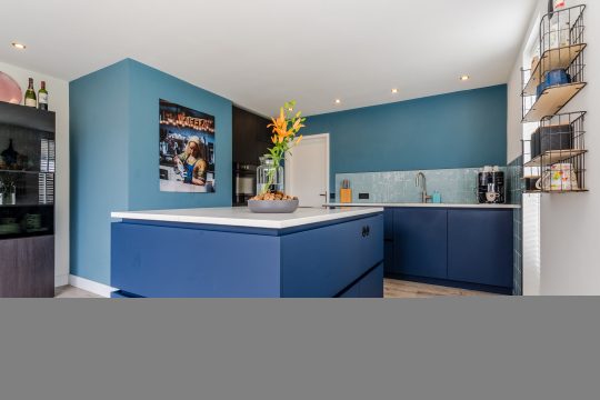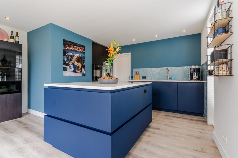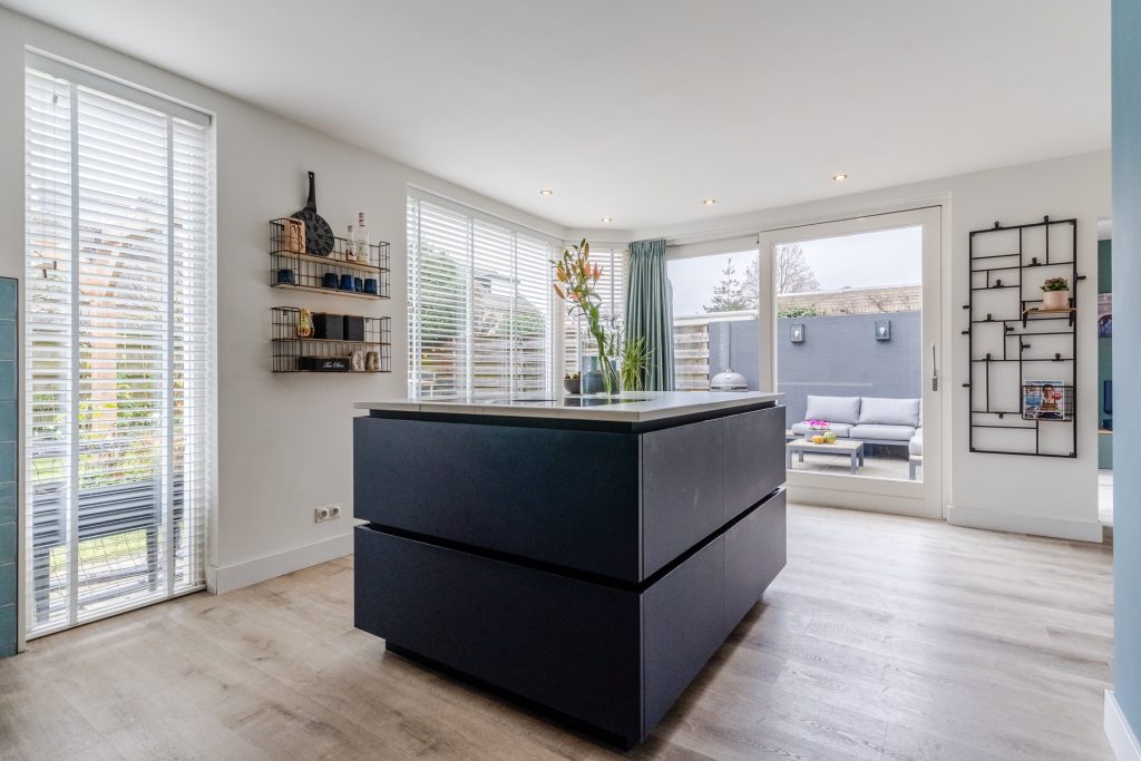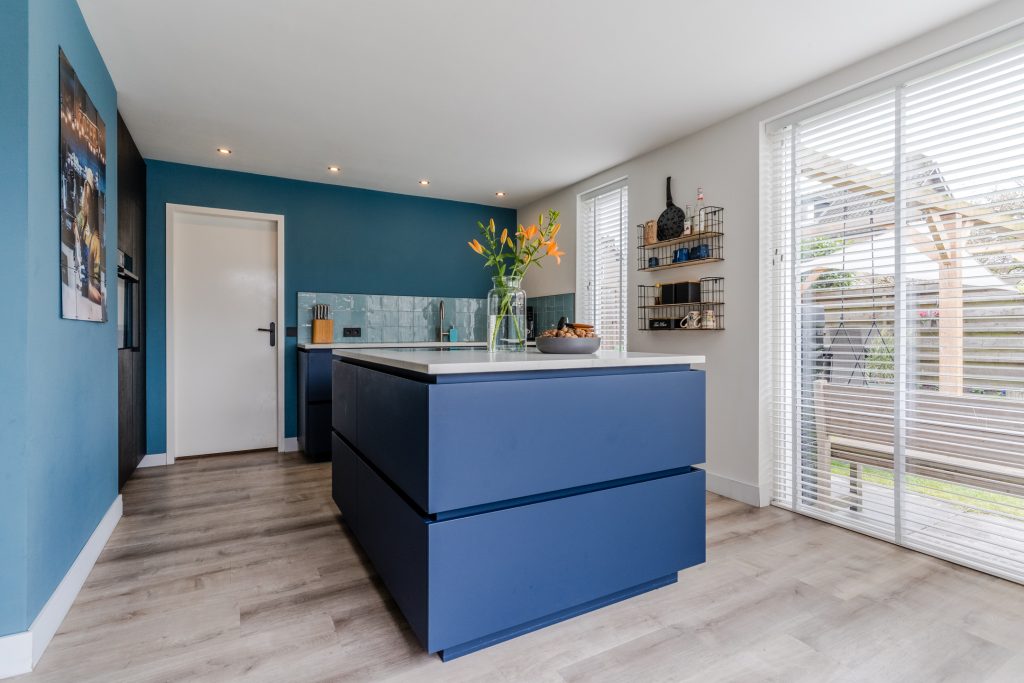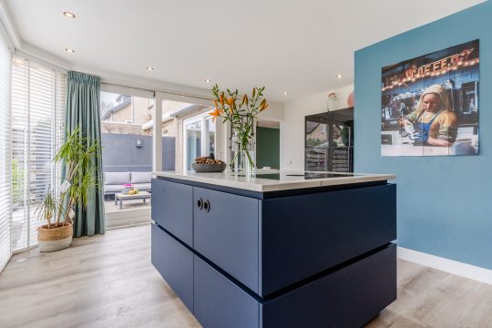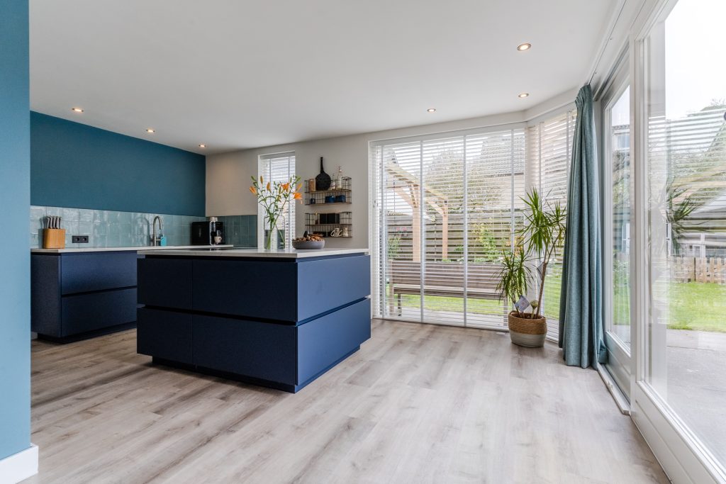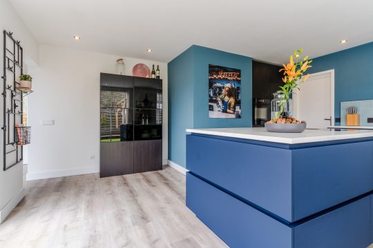 De luxueuze, matblauwe keukeninrichting is voorzien van een composiet werkblad, Quooker, vaatwasser, XXL-koelkast, combi-oven en Bora inductie kookplaat met geïntegreerde afzuiging. Het kookeiland biedt een prachtige plek om te koken en te ontspannen. Inbouwspots en de vele raampartijen zorgen voor een lichte en stijlvolle uitstraling. Daarnaast is er vele praktische kastruimte aanwezige. Vanuit hier heb je toegang tot de inpandige garage.