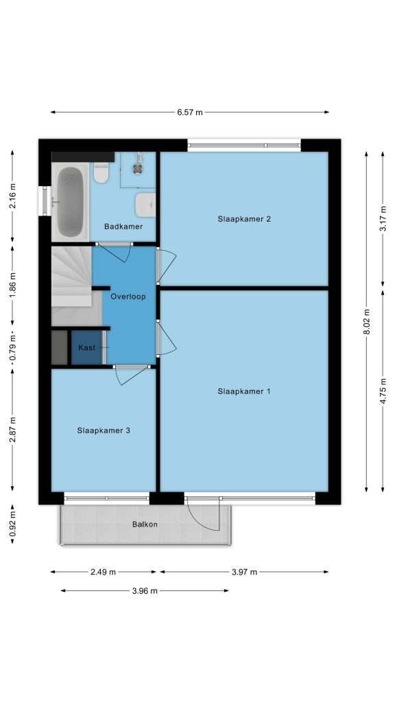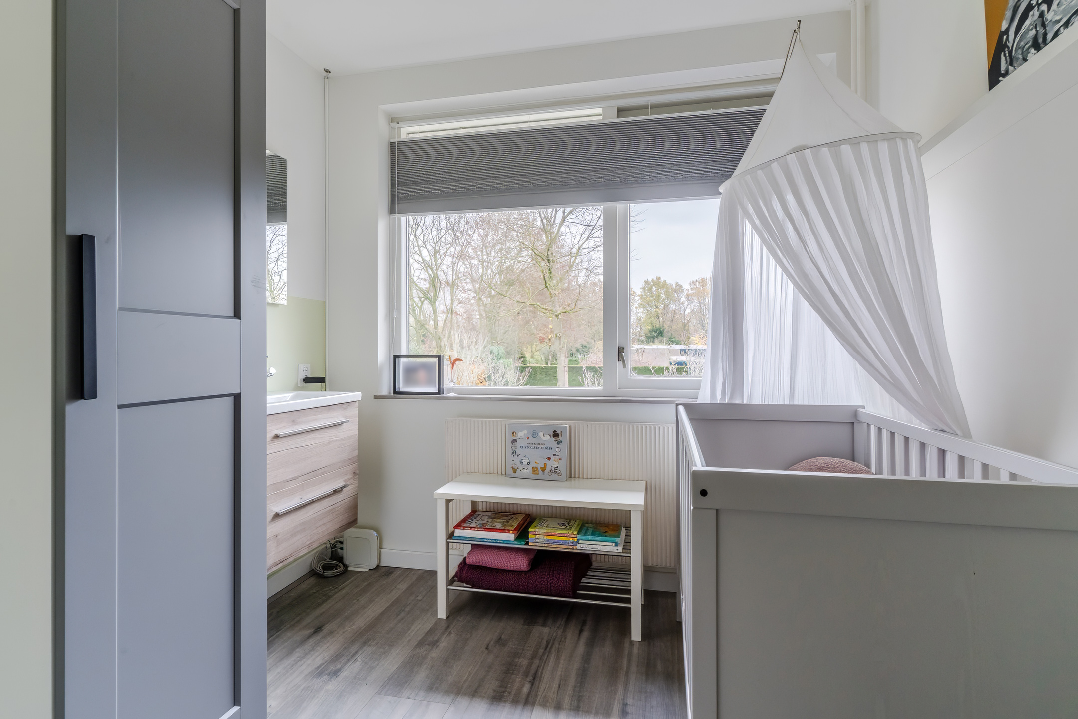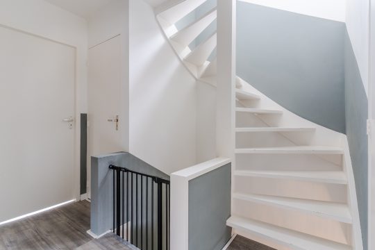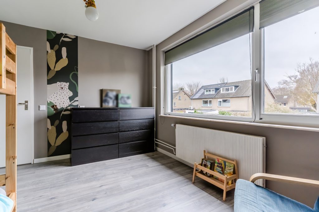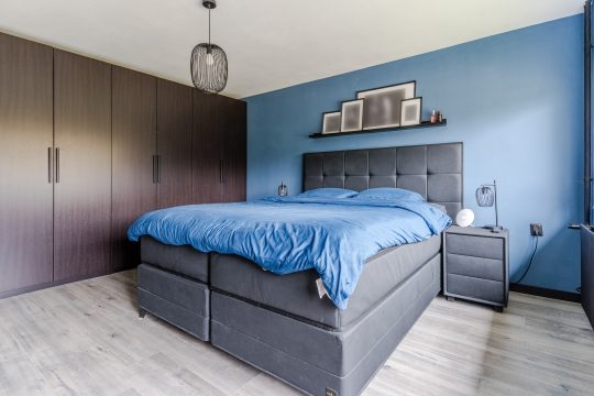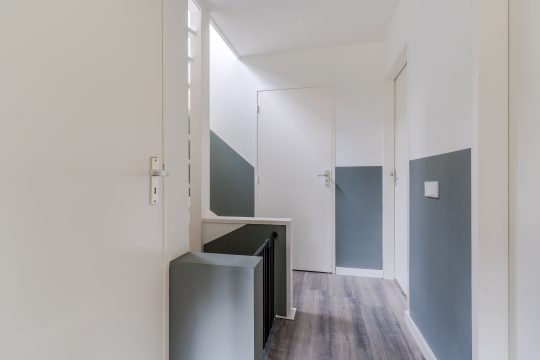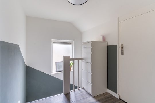 De eerste verdieping beschikt over drie ruime slaapkamers en een praktische bergkast op de overloop, afgewerkt met moderne laminaat en strakke stucwerk wanden en plafonds. De master bedroom heeft een balkon aan de voorzijde van de woning en is voorzien van een plissé hor. De slaapkamer aan de achterzijde is uitgerust met een elektrisch rolluik. Slaapkamer 3 is aan de voorzijde gelegen en kan eveneens prima dienen als kinderkamer of thuiswerkplek.