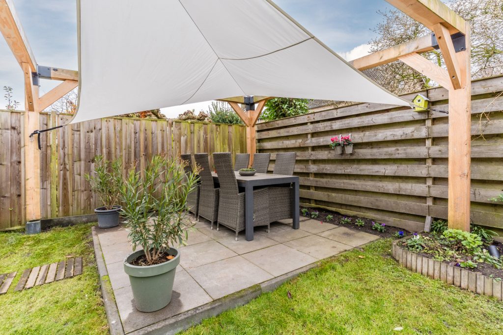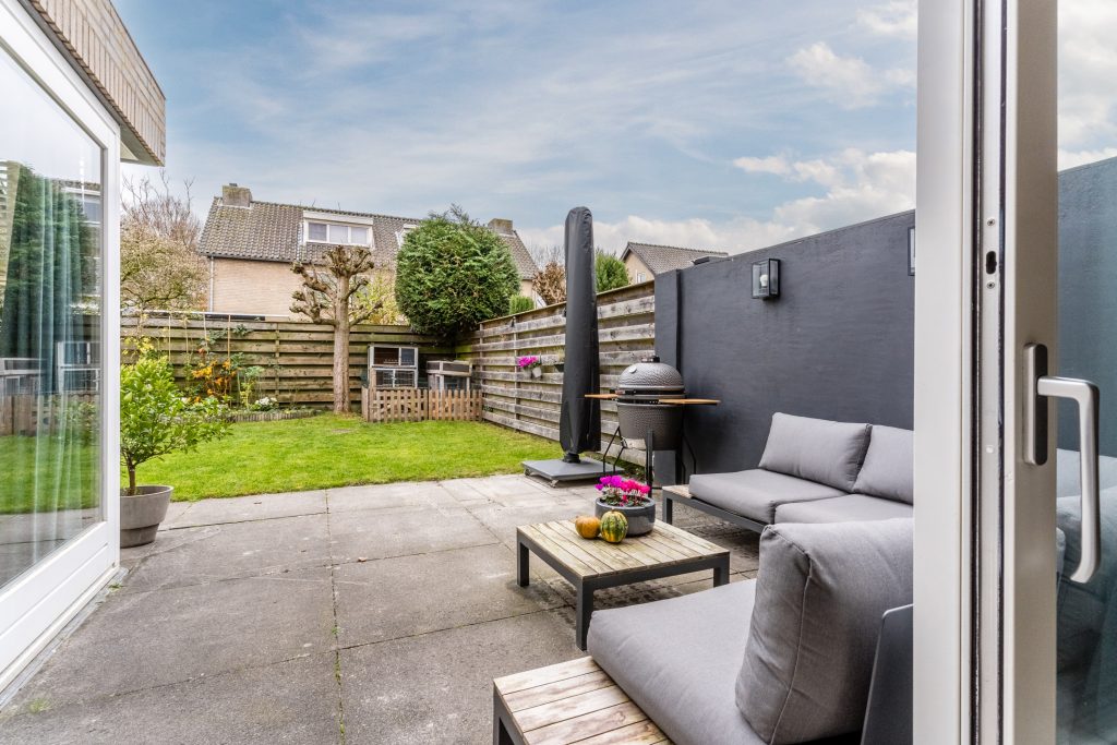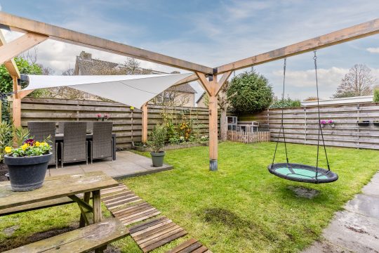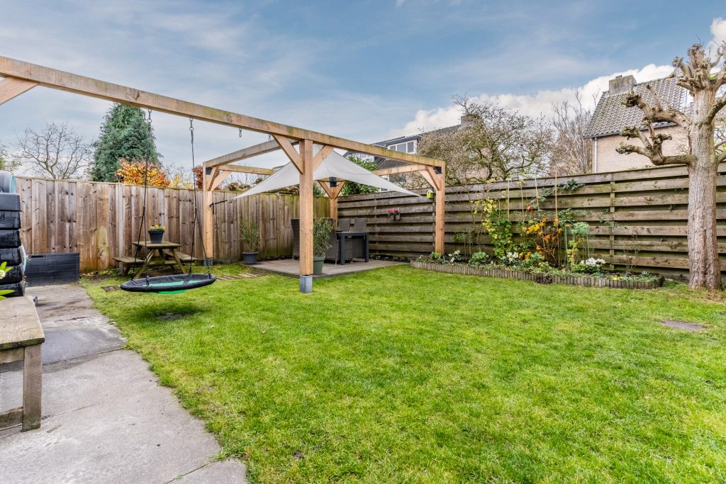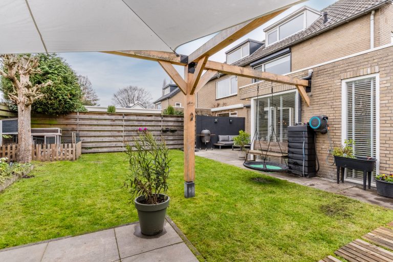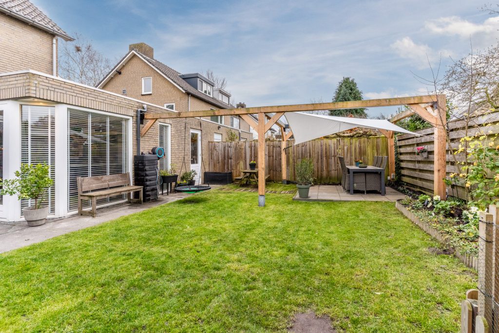 De zonnige achtertuin is gelegen op het zuidwesten en biedt een royaal terras, gazon, diverse borders en elektrische zonwering. De tuin biedt veel privacy en is aan de achterzijde voorzien van een tweede terras met schaduwdoek.