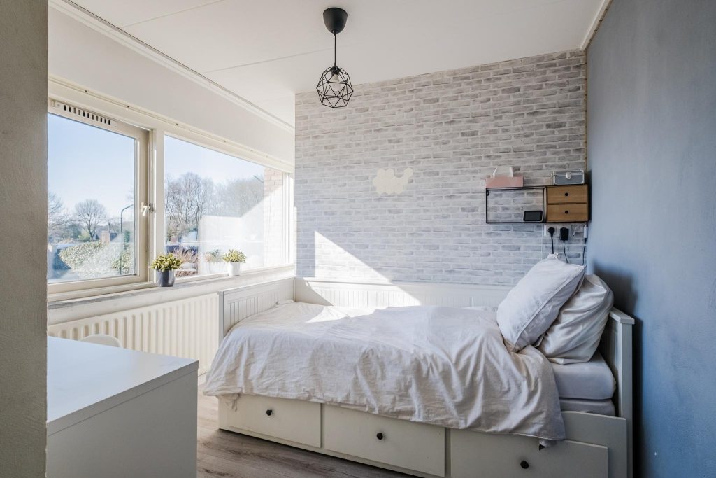 Aan de achterzijde ligt slaapkamer 3 met een laminaatvloer, stucwerkwanden en gipsplafond.