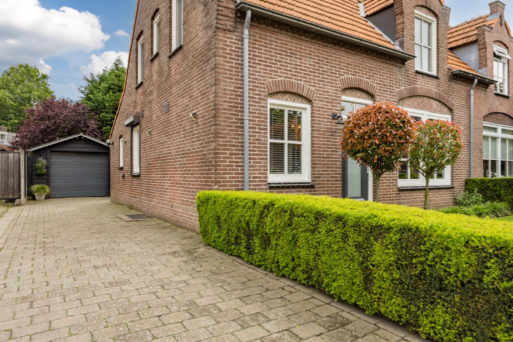 De groen aangelegde voortuin heeft een royale bestrate oprit voor meerdere auto’s. De oprit biedt toegang tot de eigen achterom en de garage.