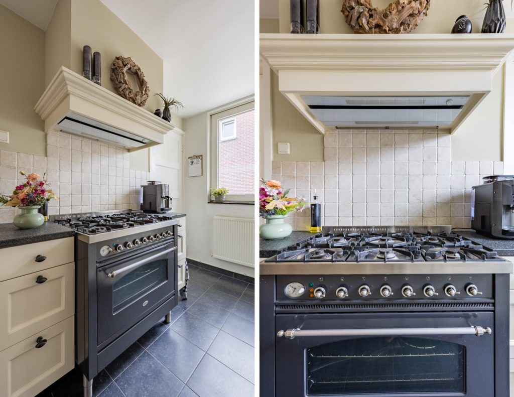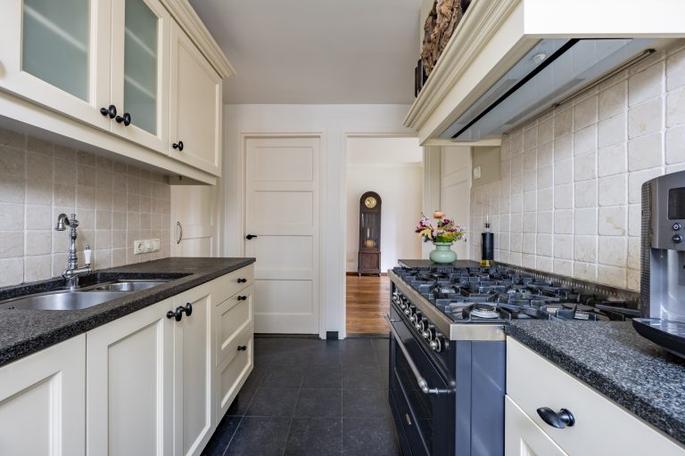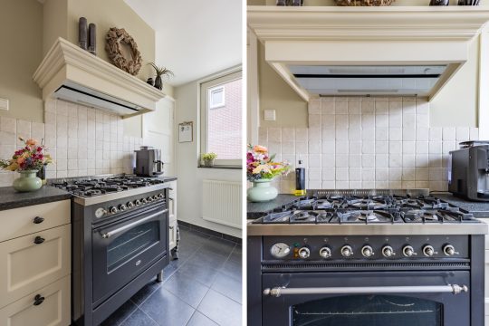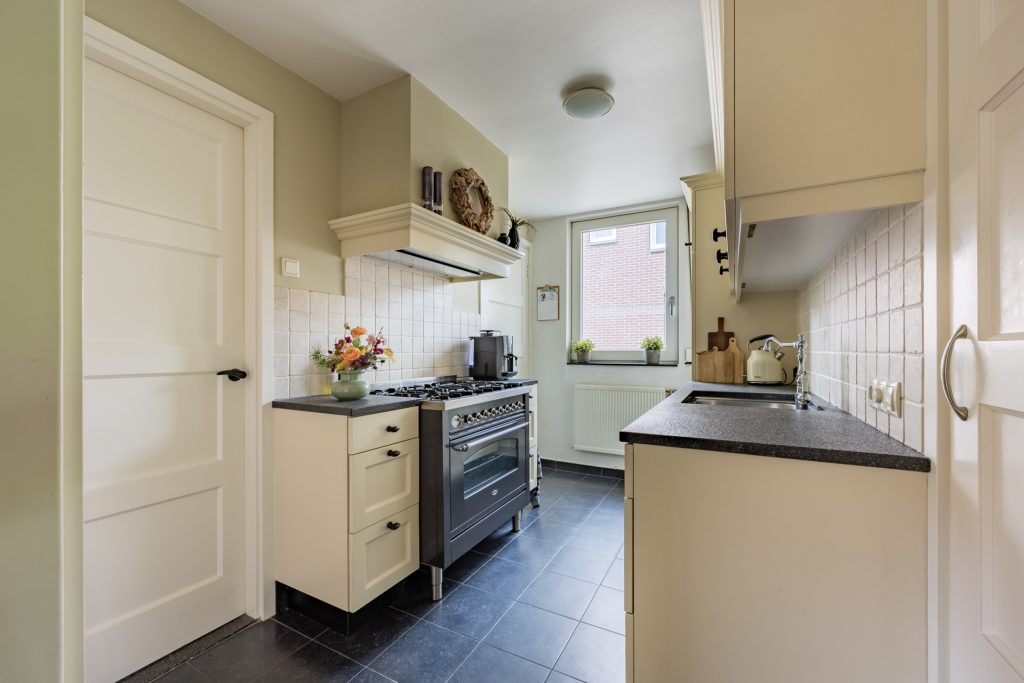 Wauw wat een plaatje is deze prachtige keuken welke perfect bij de stijl van de rest van de woning past. De maatwerk inbouwkeuken is in dubbele wandopstelling geplaatst en is voorzien van een granieten aanrechtblad. Alle apparatuur zoals een Borreti 6-pits gasfornuis met grote oven, afzuigkap, koelkast, vaatwasser en 1 1/2 spoelbak is hierbij aanwezig. Tevens zijn er volop bergmogelijkheden zo is er een provisiekast aanwezig en is er toegang tot een grote opslagkelder.