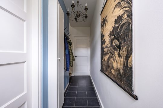 Middels de groen aangelegde voortuin met drie prachtige plataanbomen bereik je de voordeur. De entreehal is voorzien van een tegelvloer, strakke stucwerk wanden en strakke stucwerk plafond en beschikt over de gehele vernieuwde meterkast (7 groepen). Tevens is er toegang tot de moderne badkamer, de eerste verdieping en de keuken.