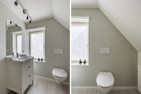 Aan de voorzijde gelegen moderne badkamer voorzien van vloerverwarming, ruime inloopdouche (met drain, regen- en handdouche), dubbele wastafel met spiegel en mechanische ventilatie.