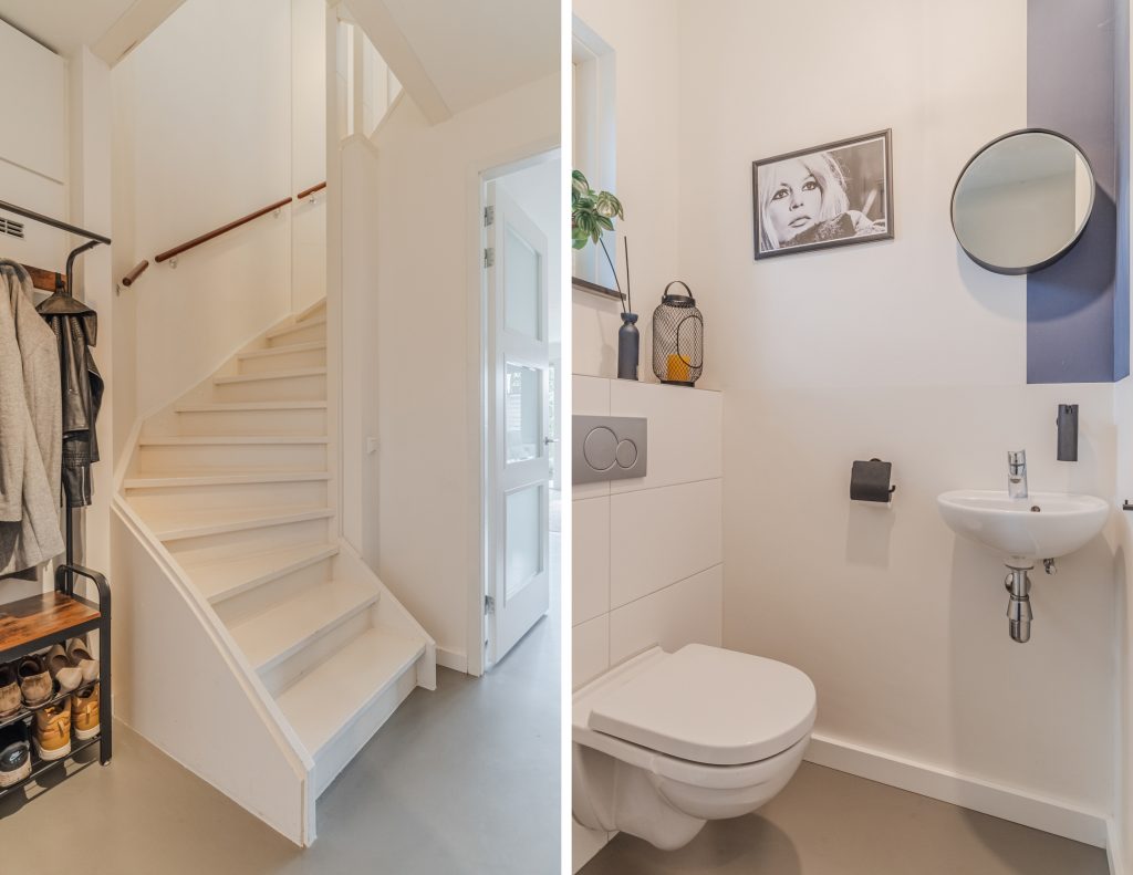 Bij binnenkomst word je verwelkomd in een ruime en lichte hal die direct de verzorgde afwerking van de woning laat zien. Hier bevinden zich de uitgebreide meterkast, een modern afgewerkte toiletruimte met wandcloset en fontein, en de trapopgang naar de eerste verdieping.