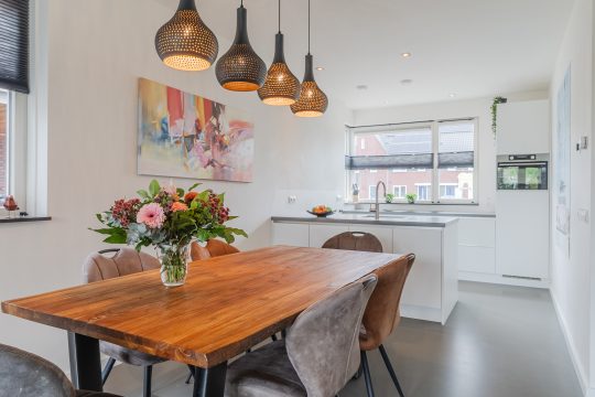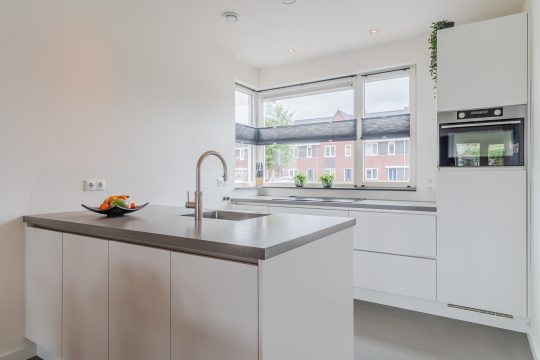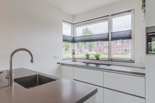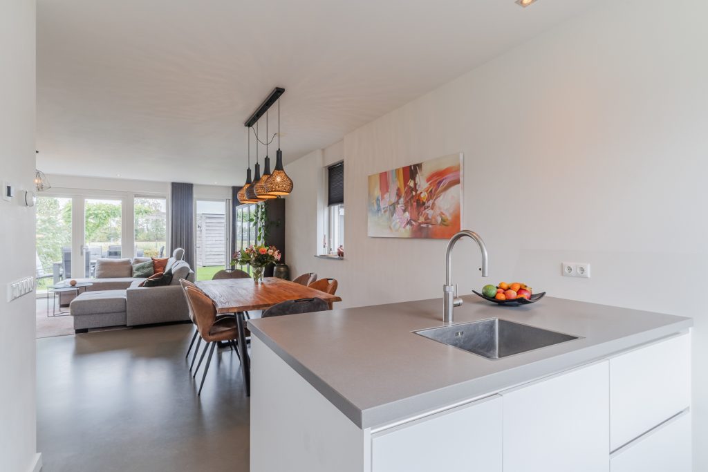 Aan de voorzijde van de woning bevindt zich de luxe open keuken, compleet uitgerust met moderne inbouwapparatuur (inductiekookplaat met geïntegreerde afzuiging, combi-oven, koelkast, vaatwasser, Quooker) en een stijlvol composiet werkblad. Terwijl u kookt, kijkt u vrij uit over het voorgelegen speelveldje — ideaal voor gezinnen met jonge kinderen.