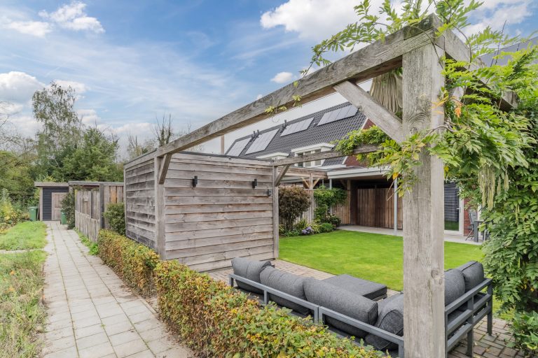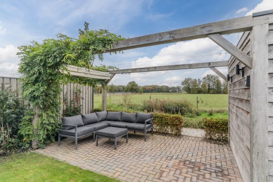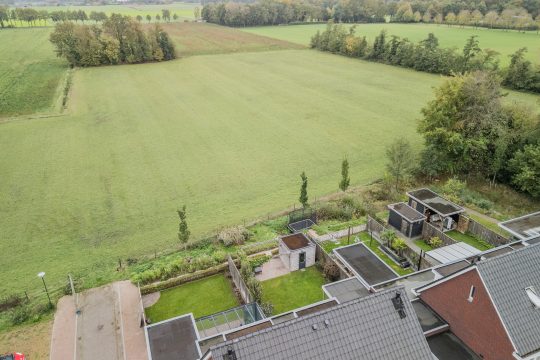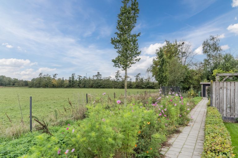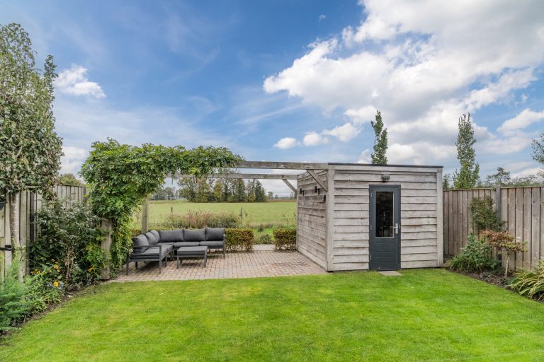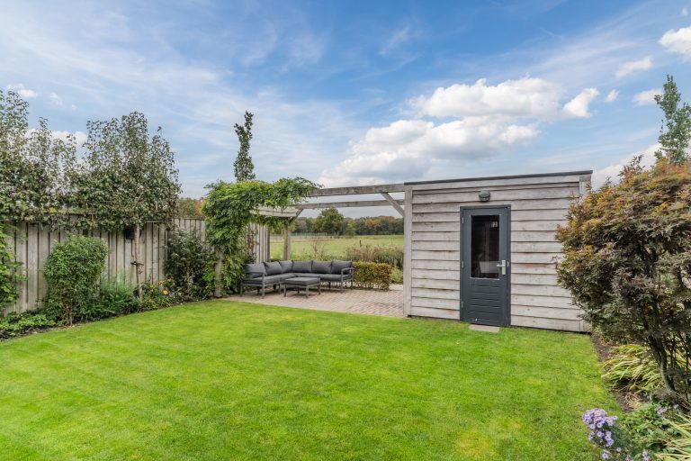 De achtertuin is fraai aangelegd, gelegen op het zonnige zuidoosten en voorzien van een ruim gazon, sierbestrating, diverse beplanting en een achterom met poort. Je geniet hier van rust, privacy en een schitterend vrij uitzicht over de uitgestrekte landerijen welke achter de woning zijn gelegen. Achterin de tuin staat een royale berging, ideaal voor fietsen of tuingereedschap.