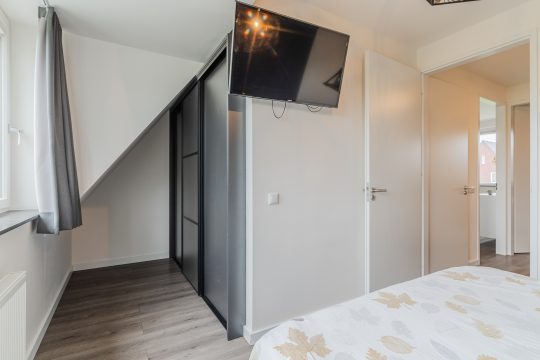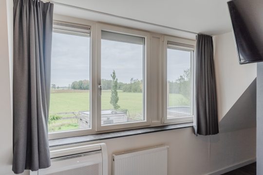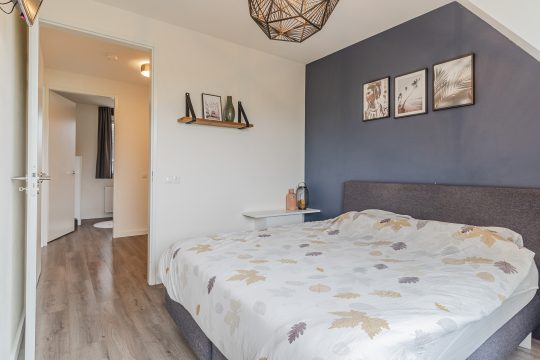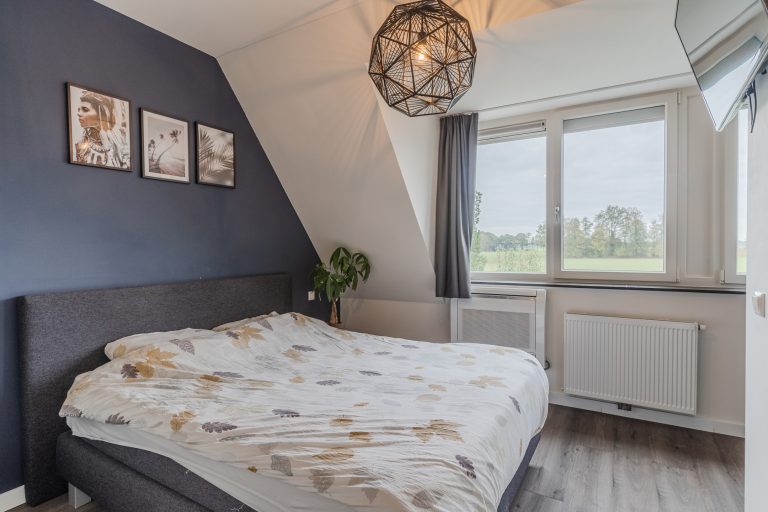 Aan de achterzijde bevindt zich de ruime ouderslaapkamer, een sfeervolle en rustige plek met een praktische inloopgarderobe en een dakkapel die niet alleen voor extra licht en ruimte zorgt, maar ook een adembenemend uitzicht biedt over de uitgestrekte landerijen achter de woning – een prachtig decor om iedere dag mee te beginnen. De slaapkamer beschikt daarnaast over airconditioning (verwarmen en koelen) en een elektrisch bedienbaar rolluik.