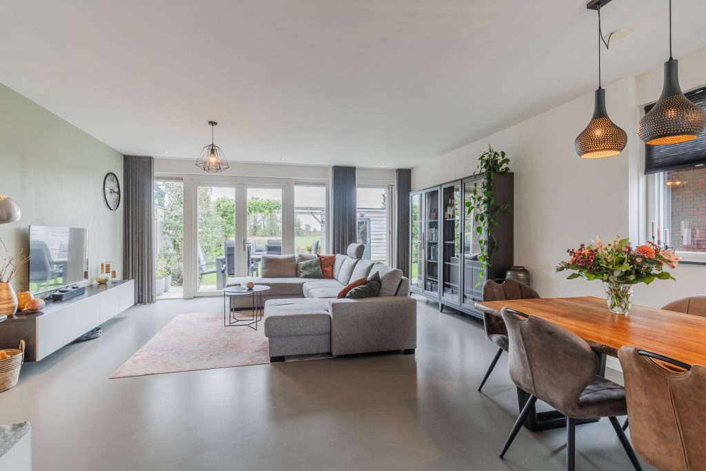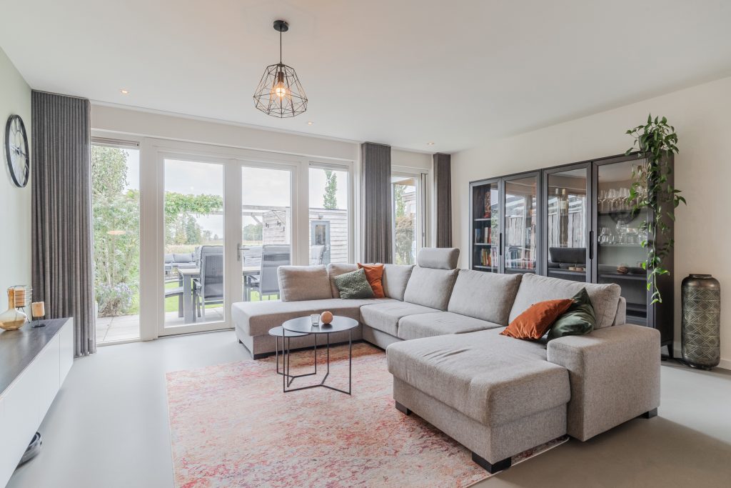 De royale woonkamer aan de achterzijde is heerlijk licht door de grote raampartijen en openslaande tuindeuren naar de zonnige tuin. Bovendien is er ook nog een enkele deur naar de tuin, voor het dagelijkse gebruik. Hier geniet u elke dag van het prachtige uitzicht over de achterliggende landerijen — een uitzicht dat nooit verveelt!