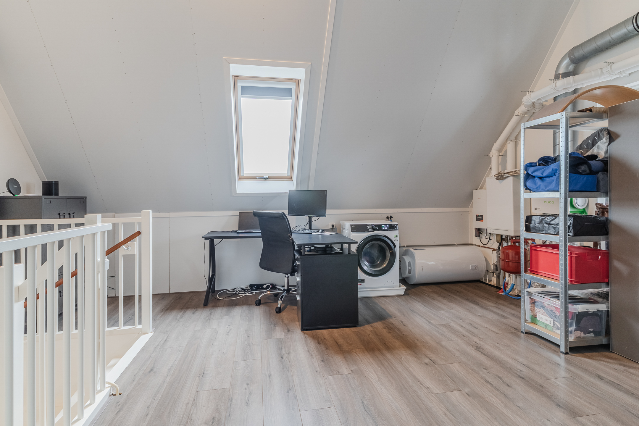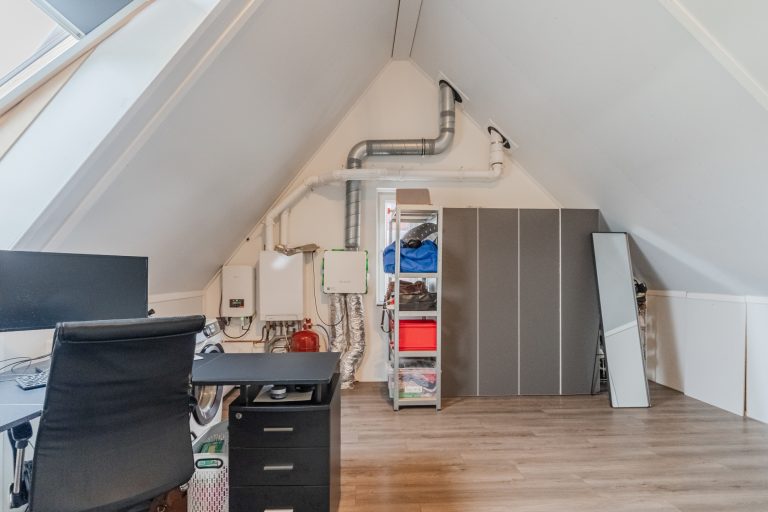 Achter de knieschotten bevindt zich extra opbergruimte, ideaal voor seizoensspullen of koffers. Daarnaast vind je op deze verdieping de cv-installatie, mechanische ventilatie unit en de aansluitingen voor wasapparatuur.