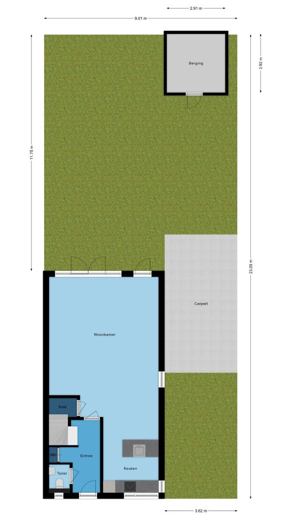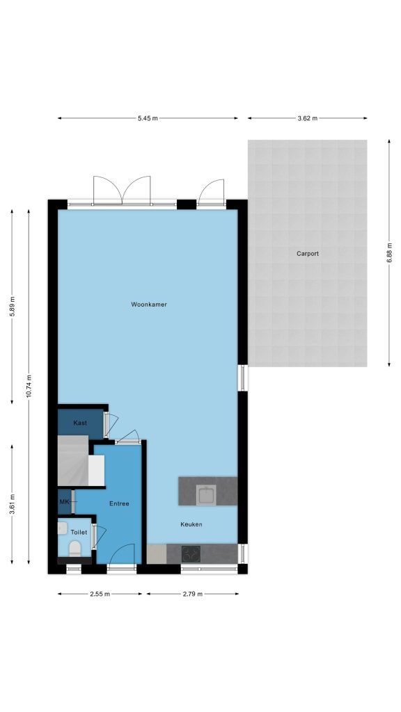 Aan de voorzijde beschikt de woning over een oprit met carport en plaats voor meerdere auto’s.
