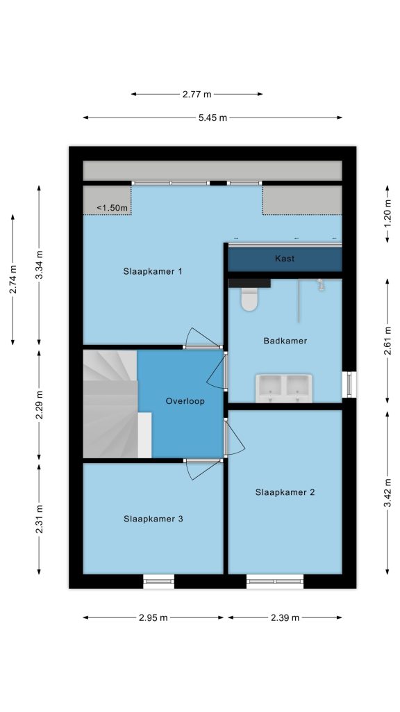 Vanaf de overloop, met vaste trapopgang naar de zolderverdieping, heb je toegang tot drie slaapkamers en de moderne badkamer.