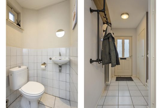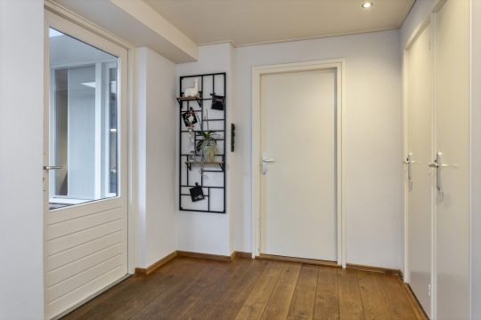 Entreehal met tegelvloer, halfhoog betegeld toilet met fonteintje, vernieuwde meterkast (voorzien van 8 groepen, 2 krachtstroomgroepen en 3 aardlekschakelaars), praktische kelderkast, toegang tot de woonkamer en trapopgang naar de 1e verdieping.
