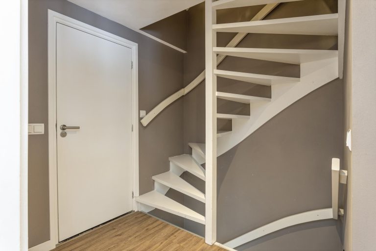 Overloop met PVC-vloer, toegang tot 3 slaapkamers en de badkamer, alsmede een vaste trapopgang naar de 2e verdieping.