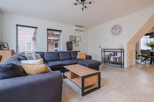 De woonkamer is werkelijk een eyecatcher. Door de forse uitbouw aan de voorzijde is een uitzonderlijk royale leefruimte ontstaan waar licht en ruimte de hoofdrol spelen. De combinatie van de strakke tegelvloer, glad gestucte wanden en plafonds met inbouwspots en de prachtige lichtstraat zorgt voor een moderne en warme uitstraling. De aanwezige airconditioning (verwarmen én koelen) garandeert hier het hele jaar door optimaal comfort.