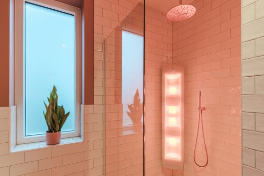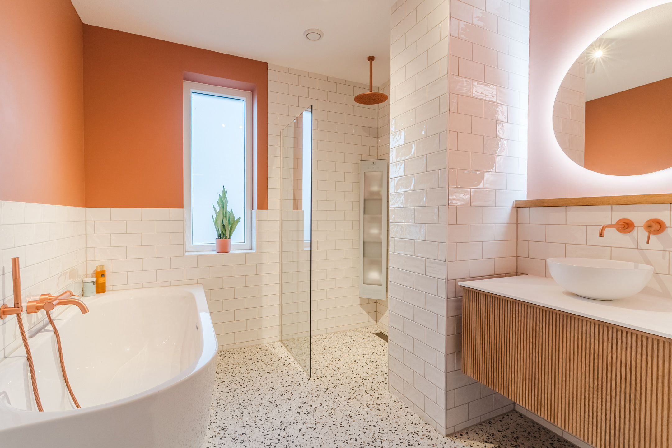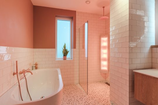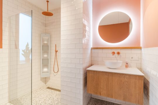 De badkamer is een echte blikvanger: modern, sfeervol en voorzien van alle gemakken zoals een inloopdouche met Sunshower-combi (infrarood en zonnebankfunctie), een ligbad en een stijlvol wastafelmeubel voorzien van spiegel met ingebouwde verlichting en verwarming. Hier kun je heerlijk ontspannen na een lange dag.