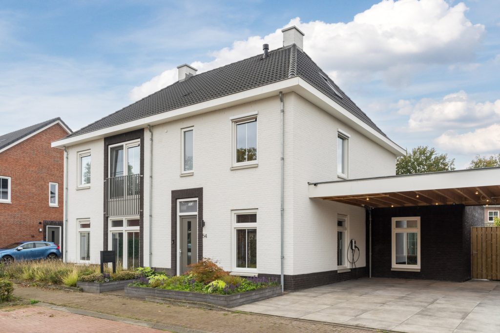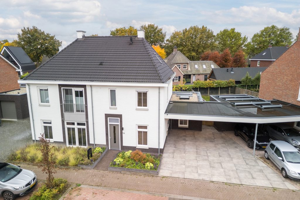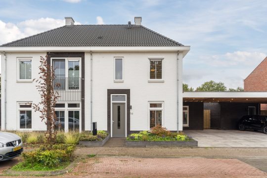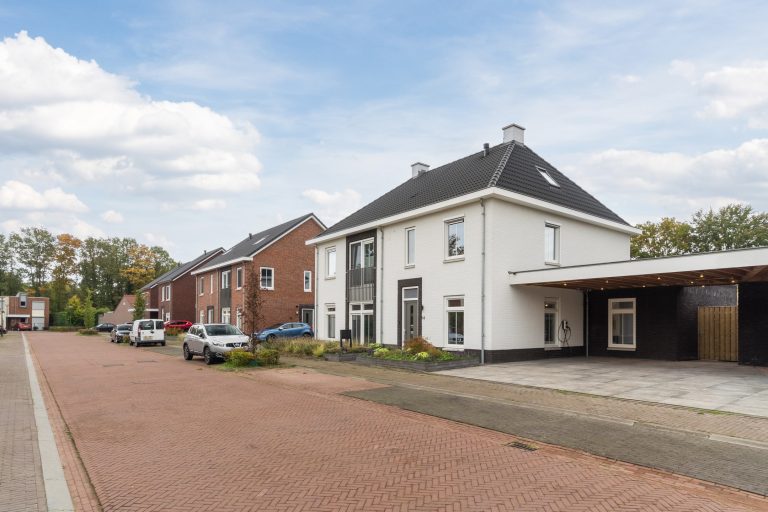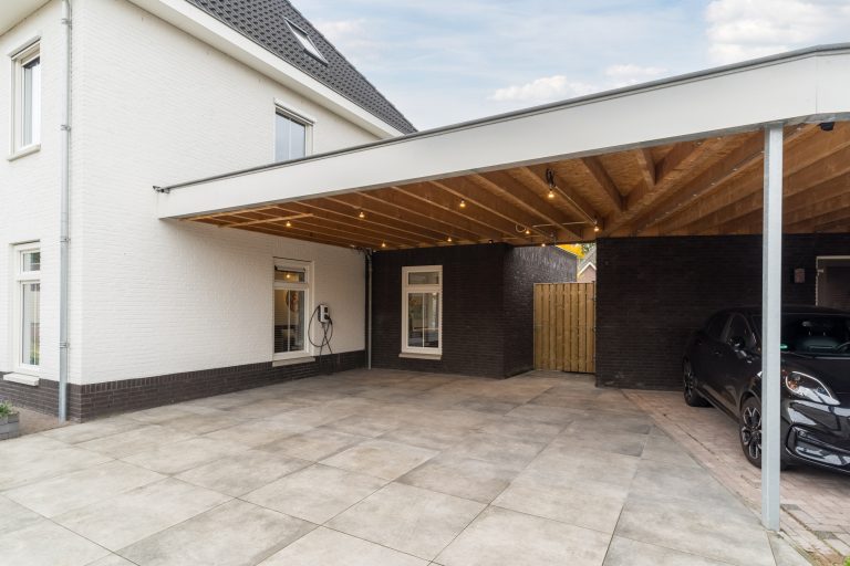 De voortuin is keurig aangelegd en de brede oprit met carport biedt parkeergelegenheid voor meerdere auto’s.
