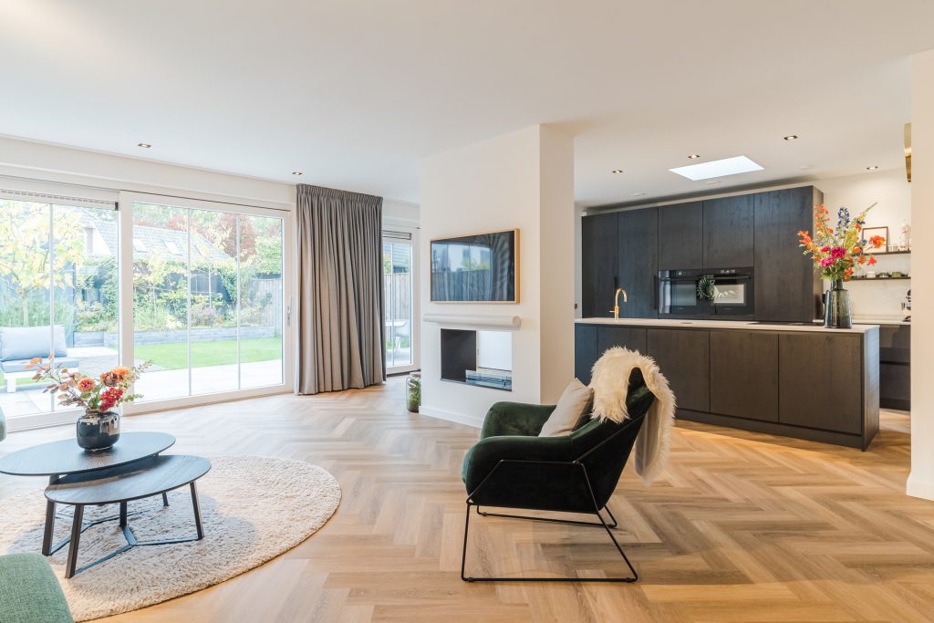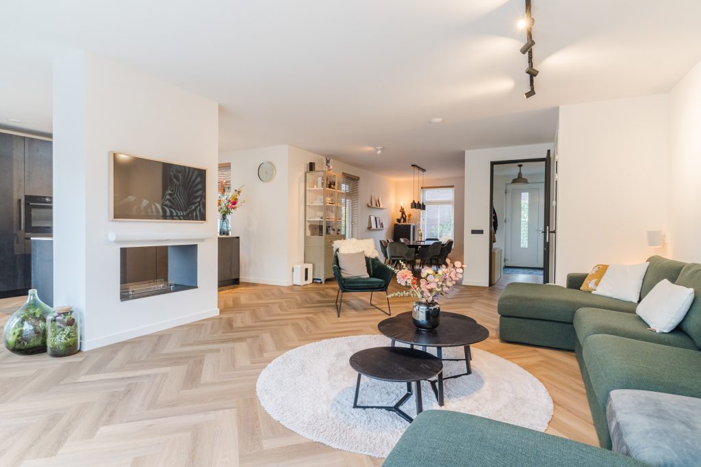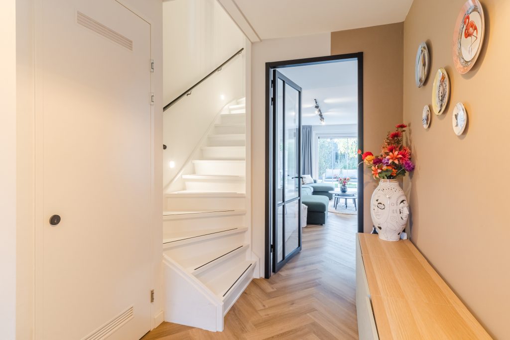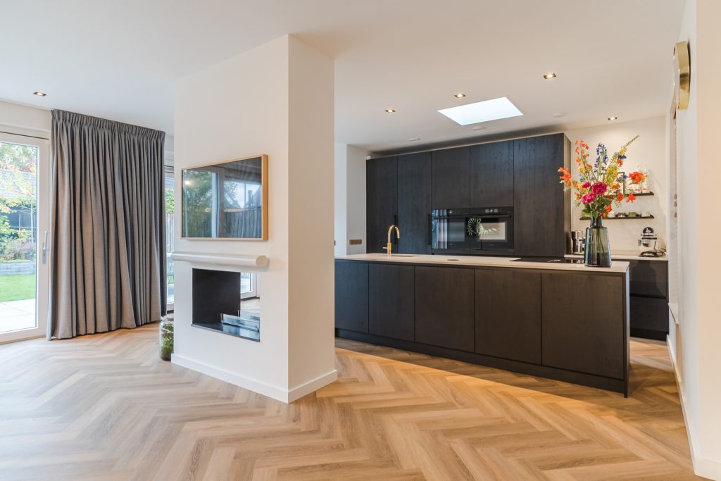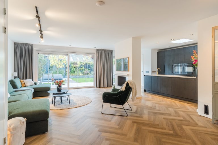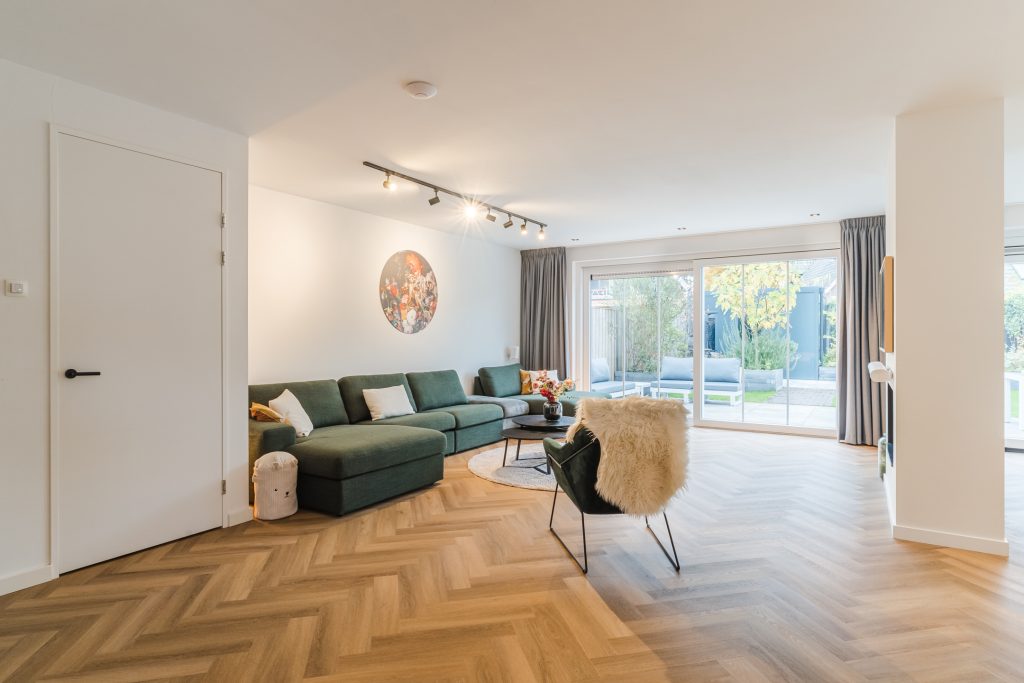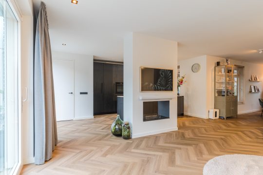 De woonkamer is een echte verrassing: zeer ruim, sfeervol en speels ingedeeld met grote ramen die zorgen voor veel lichtinval en een prettig uitzicht op zowel de voor- als achterzijde van de woning. De hoge plafonds en de fraaie afwerking middels een visgraat PVC-vloer dragen bij aan het gevoel van luxe en ruimte. In de trapkast is de aardwarmtepomp opgesteld en vind je tevens extra bergruimte. Middels een schuifpui is er tevens toegang tot de achtertuin.