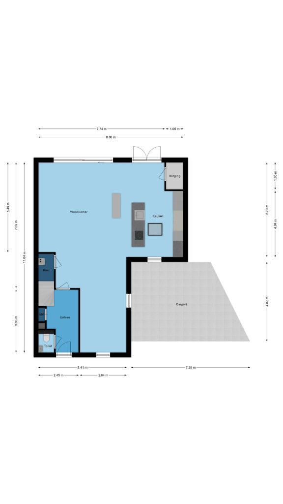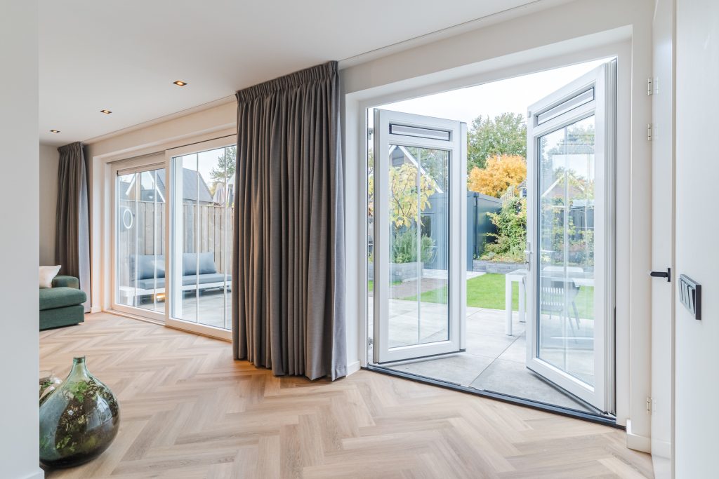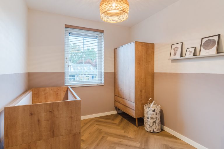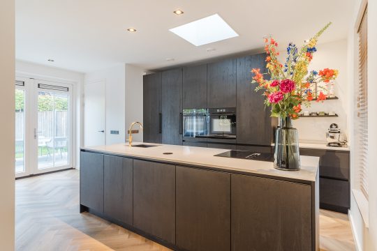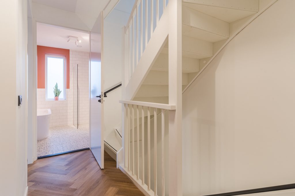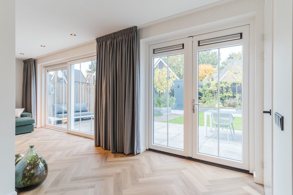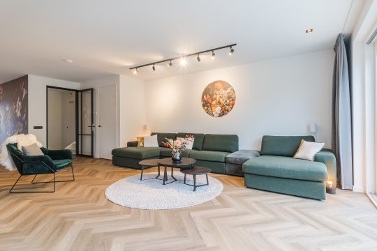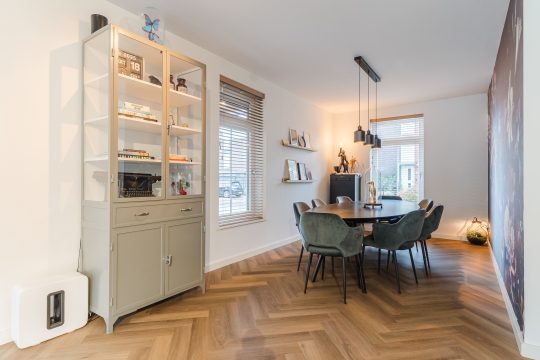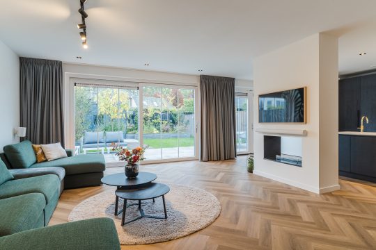 De woonkamer is een echte verrassing: zeer ruim, sfeervol en speels ingedeeld met grote ramen die zorgen voor veel lichtinval en een prettig uitzicht op zowel de voor- als achterzijde van de woning. De hoge plafonds en de fraaie afwerking middels een visgraat PVC-vloer dragen bij aan het gevoel van luxe en ruimte. In de trapkast is de aardwarmtepomp opgesteld en vind je tevens extra bergruimte. Middels een schuifpui is er tevens toegang tot de achtertuin.