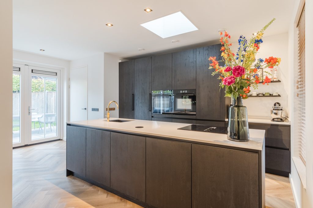 De dubbele tuindeuren geven direct toegang tot de prachtig aangelegde achtertuin, waardoor binnen en buiten naadloos in elkaar overlopen. Bovendien is er in het plafond een stijlvolle lichtkoepel ingebouwd welke met afstandbediening te openen is. Als extraatje is ook nog een riante voorraadkast aanwezig voor alle keukenvoorraad.