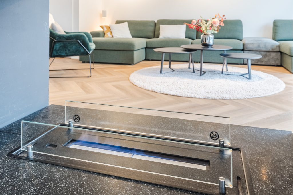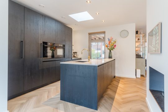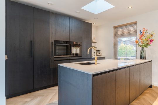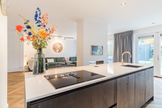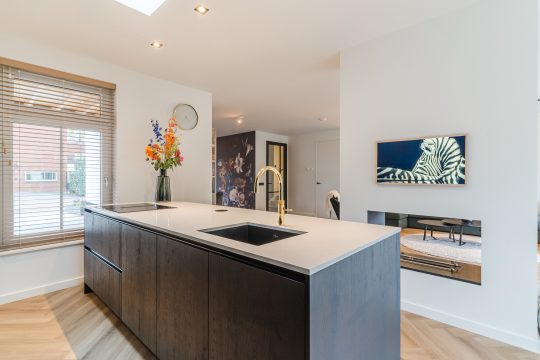 De half-open keuken aan de rechterzijde is middels een fraaie doorkijk-bio-ethanolhaard deels afgescheiden van de woonkamer en is een waar kookparadijs! Uitgevoerd in een luxe, moderne stijl met hoogwaardige inbouwapparatuur, veel werkruimte en een praktische indeling. Hier kook je met plezier terwijl je in contact blijft met het gezin of gasten in de woonkamer of aan de eettafel. De keuken beschikt over een inductiekookplaat met geïntegreerde afzuiging, koelkast, vriezer, oven, combi-oven, vaatwasser, Quooker, composiet aanrechtblad en een gezellige koffie-corner.