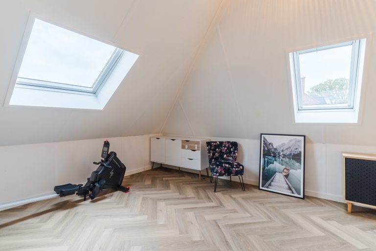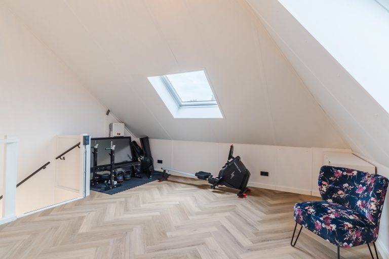 Via een vaste trap bereik je de ruime zolderverdieping. Deze verdieping biedt volop mogelijkheden: een extra slaapkamer, werkkamer, hobbyruimte of zelfs een fitnessruimte – het kan allemaal!