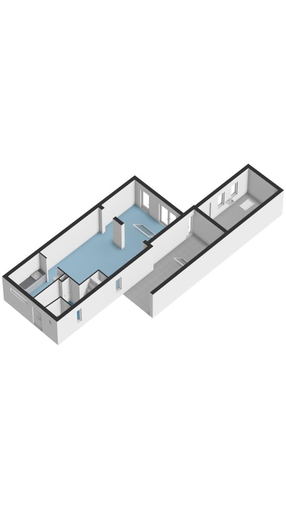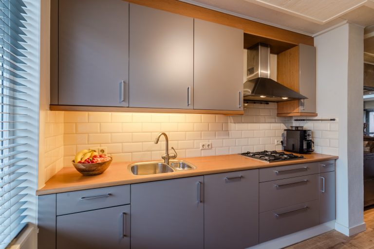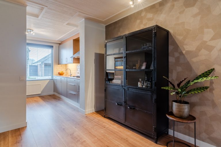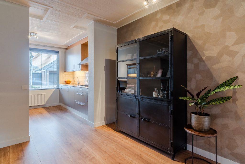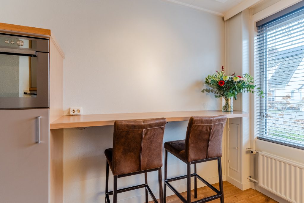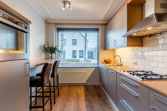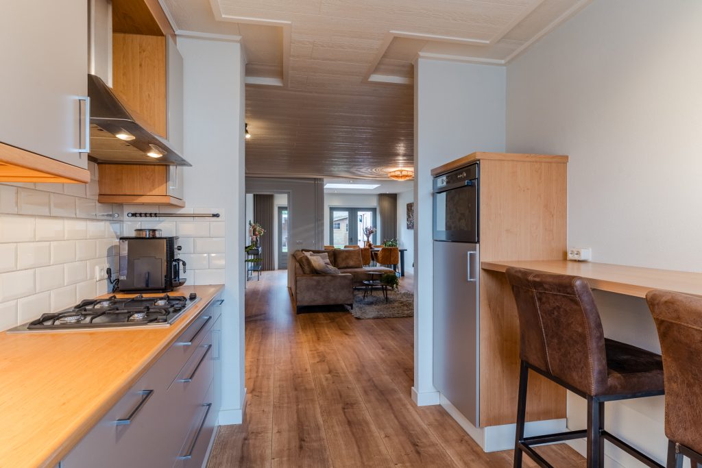 Aan de voorzijde bevindt zich de half-open keuken, ingericht in een nette wandopstelling en compleet uitgerust met een gaskookplaat, afzuigkap, vaatwasser, koelkast, combi-oven en een gezellige eetbar – dé plek voor een snel ontbijt of een borrelmoment.