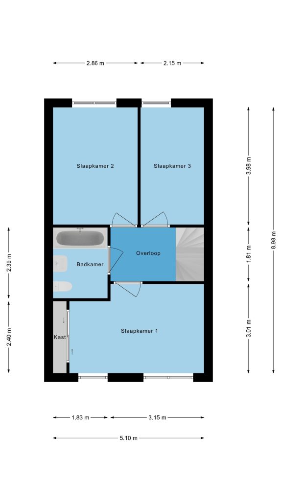 Eerste verdieping – Drie royale slaapkamers en complete badkamer