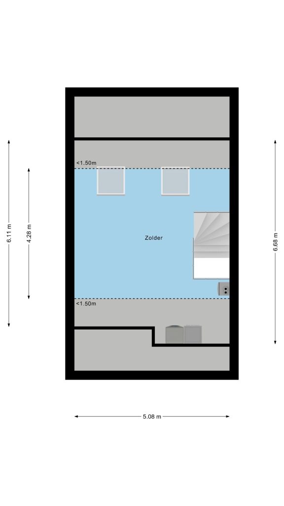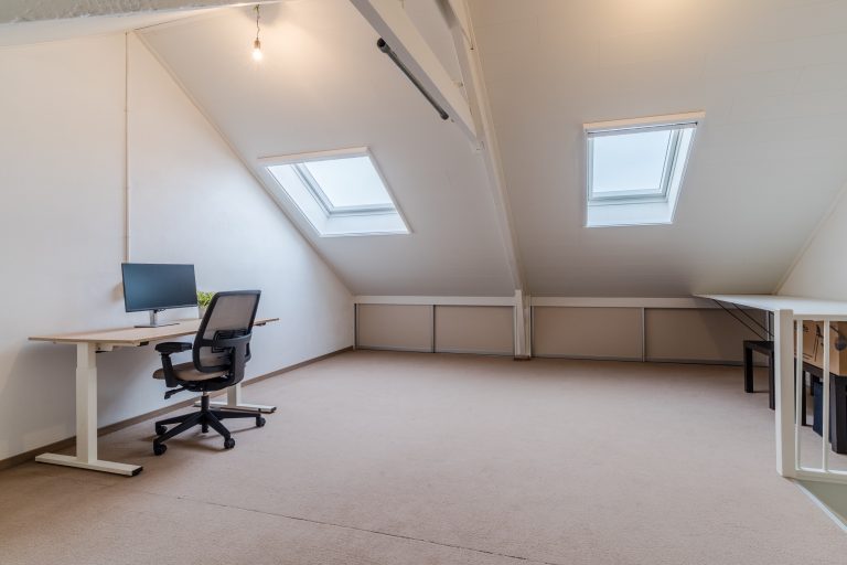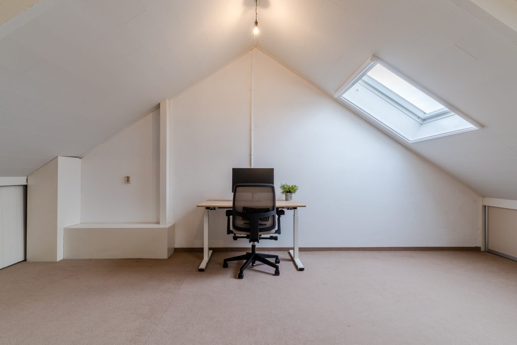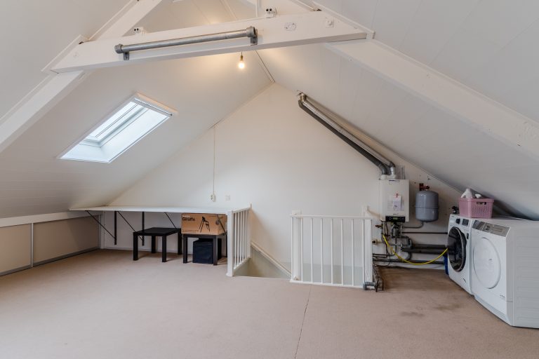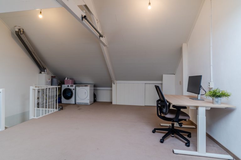 Via een vaste trap kom je op de grote zolderkamer, die perfect dienst kan doen als vierde slaapkamer, werkruimte of hobbykamer. Deze verdieping is voorzien van vloerbedekking, twee Velux dakvensters, aansluiting voor de wasmachine, de mechanische ventilatie-unit en de c.v.-installatie. Aan beide zijden is praktische bergruimte onder de dakschuinte aanwezig.