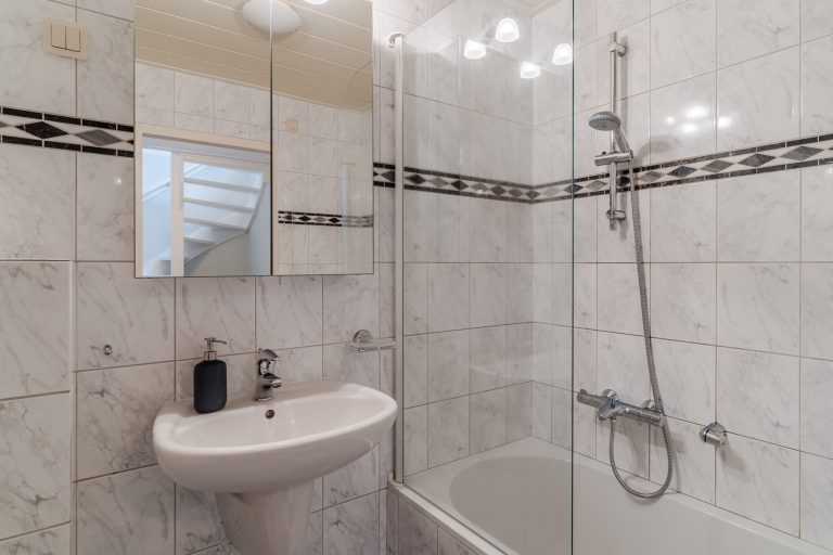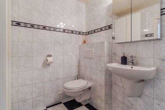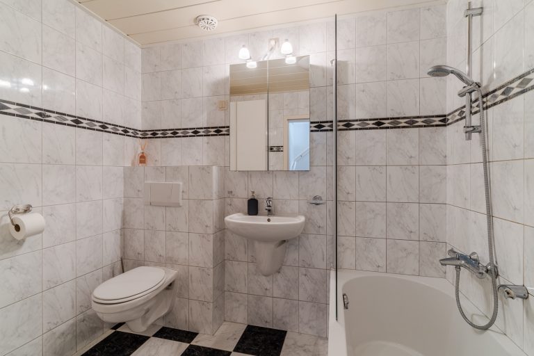 De volledig betegelde badkamer is netjes en compleet uitgevoerd met een ligbad-/douchecombinatie, wandcloset en een wastafel met spiegelkast en dubbele wandkast – ideaal voor het hele gezin.
